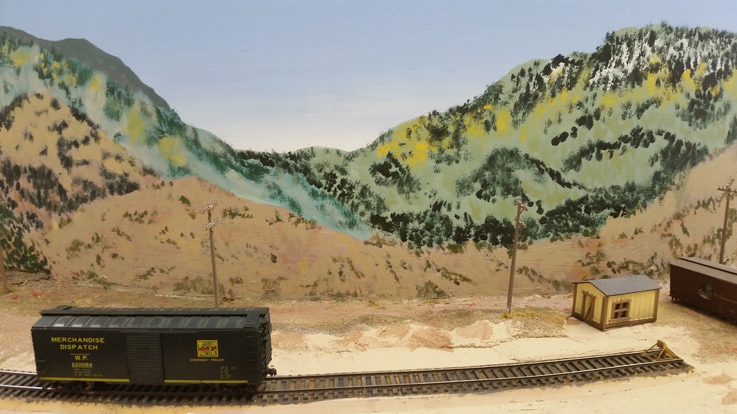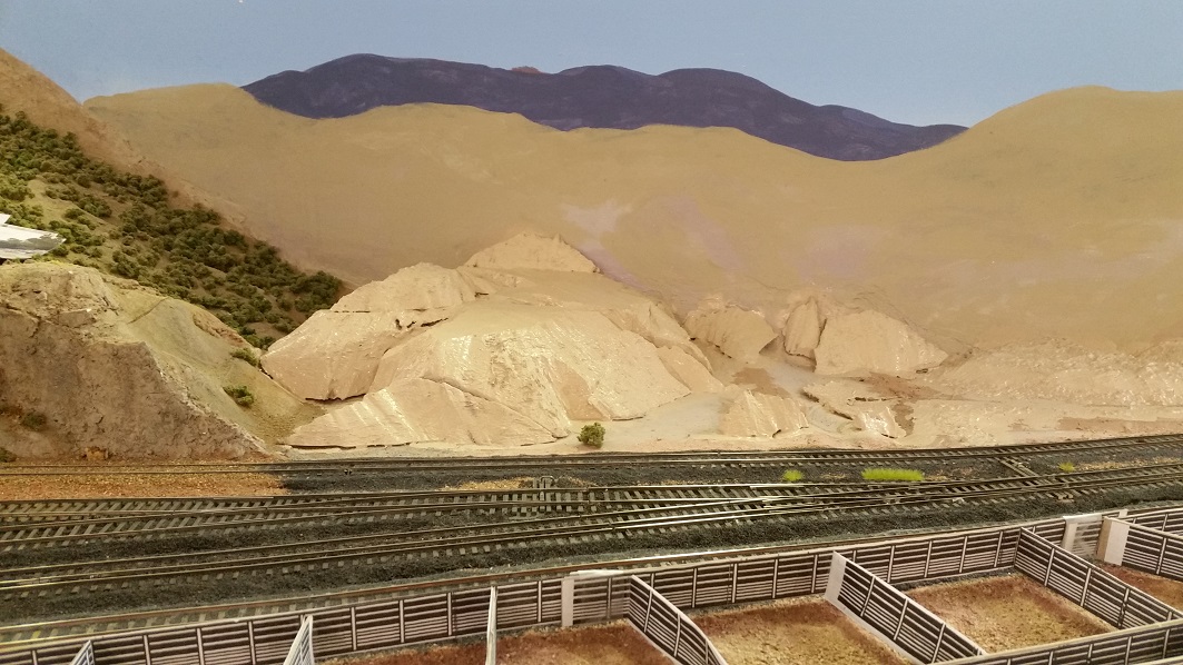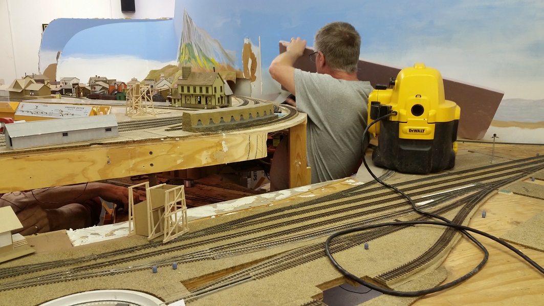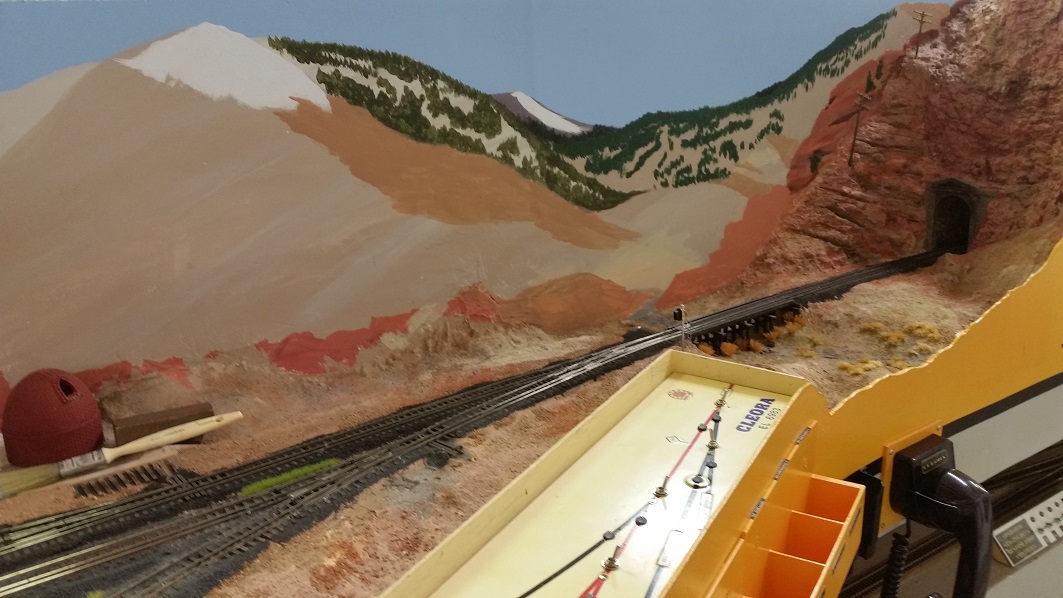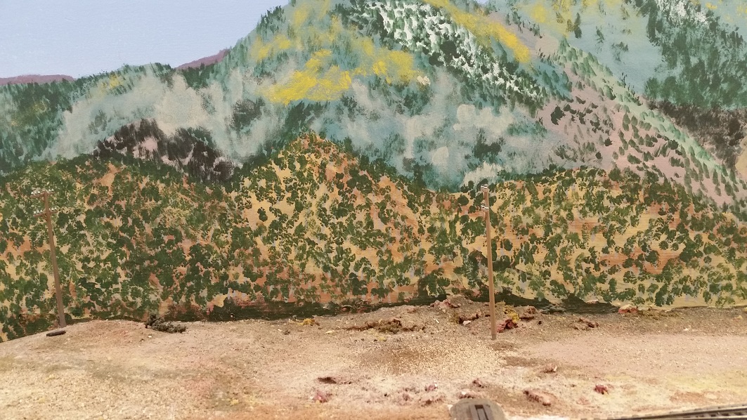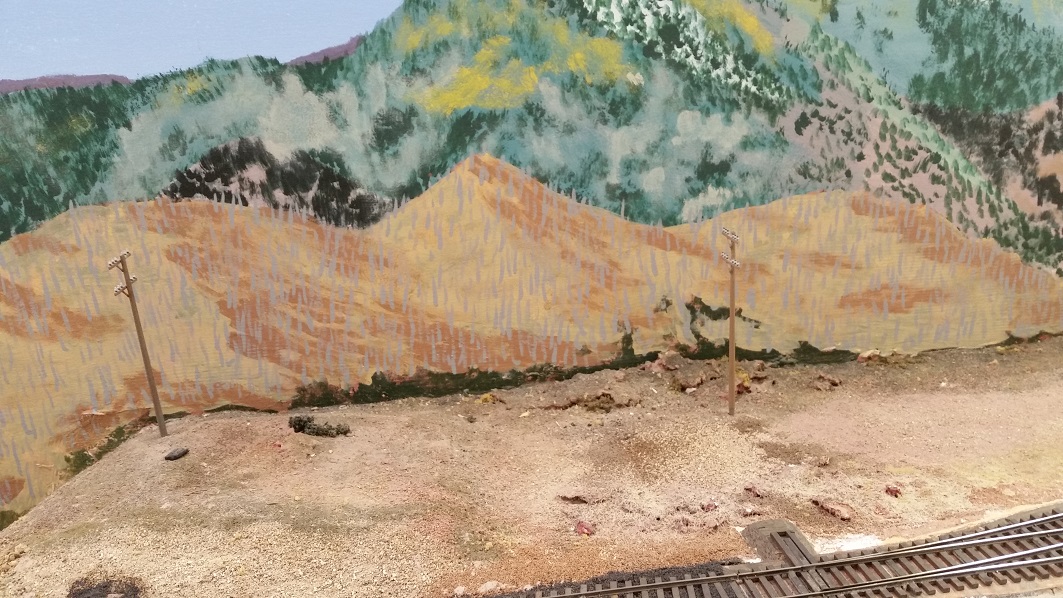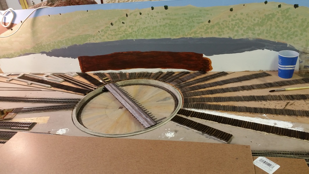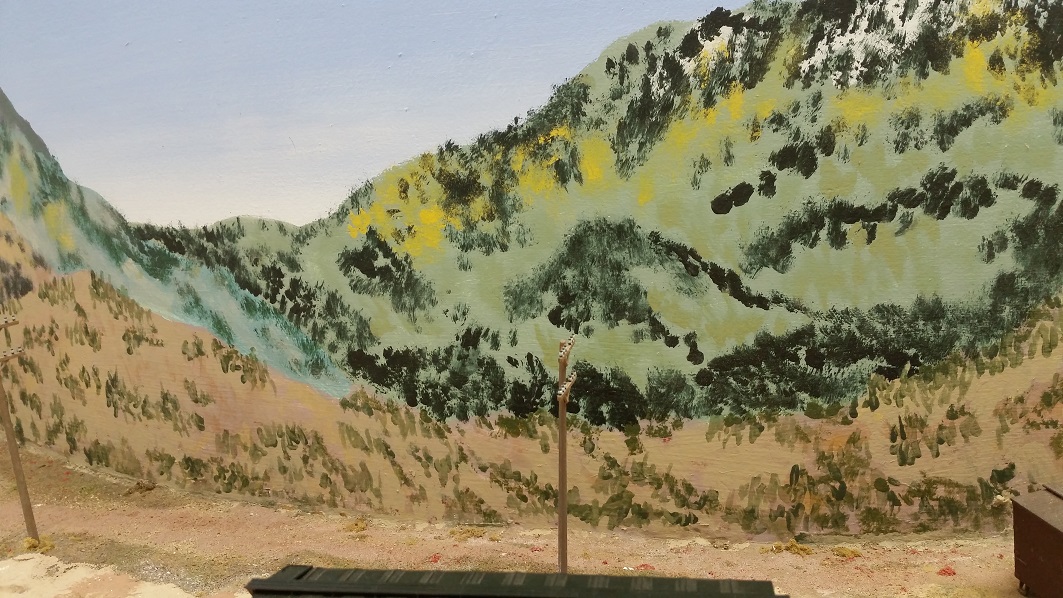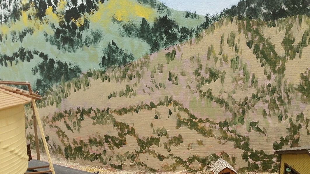 GaryM continued re-touching the backdrop along the front. The pinkish foreground hills were painted over in camel (tan), and