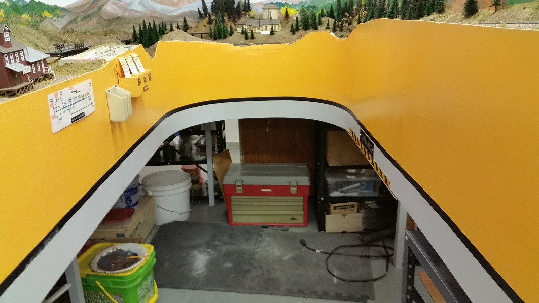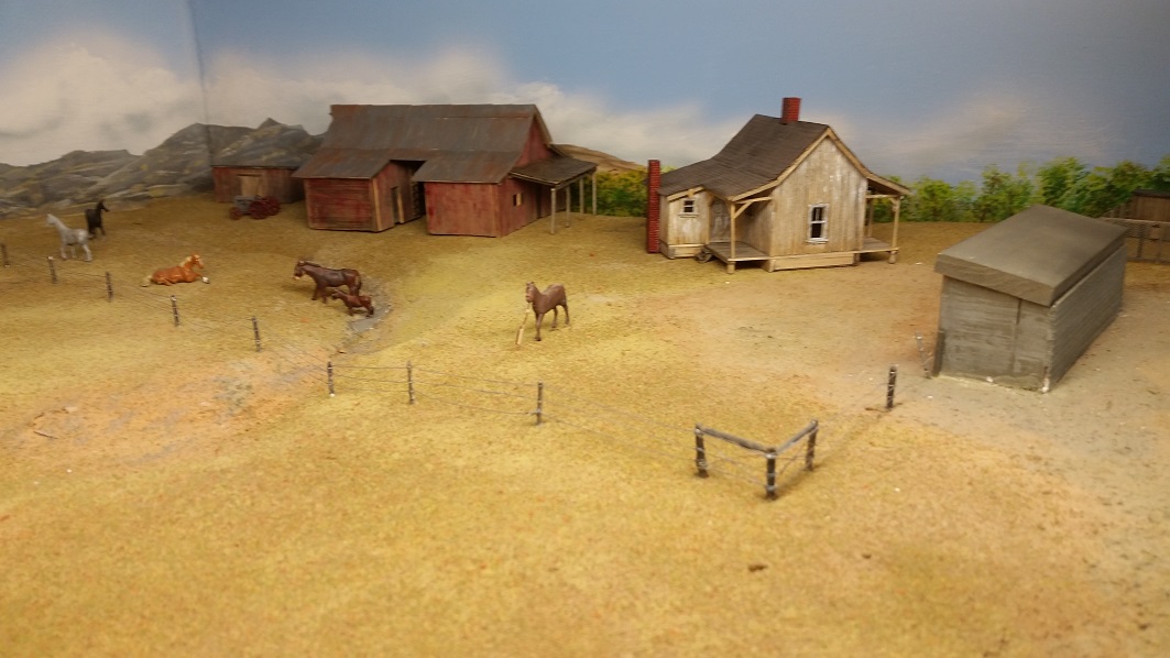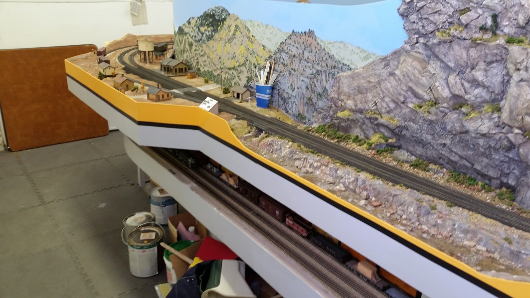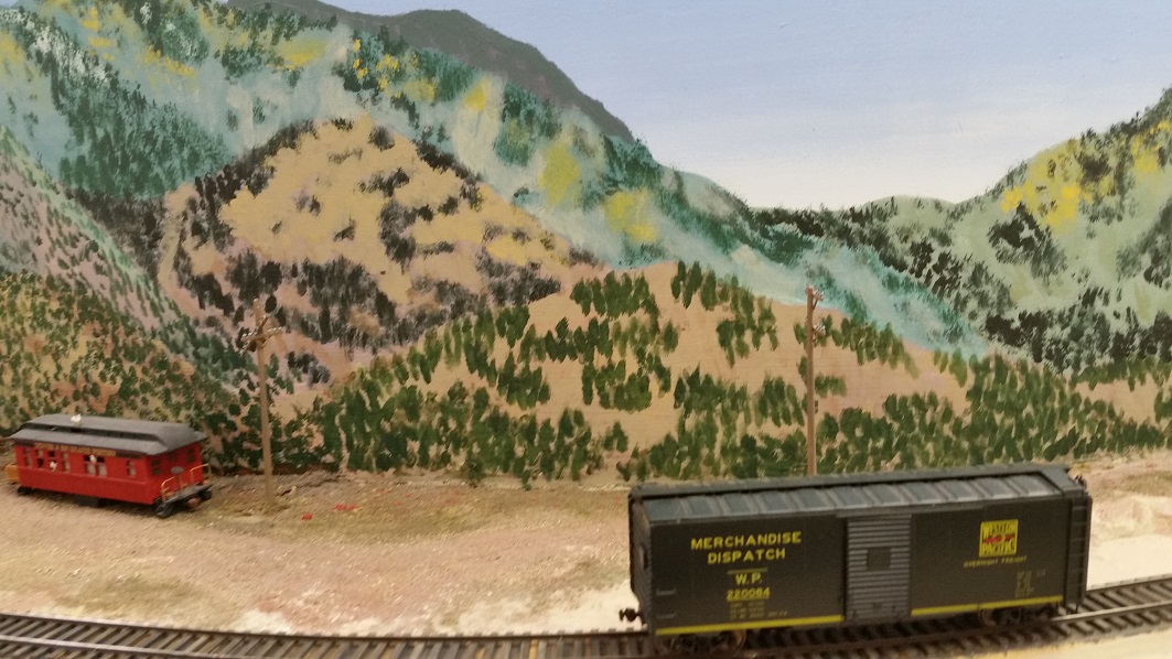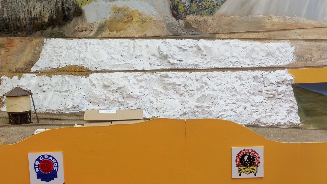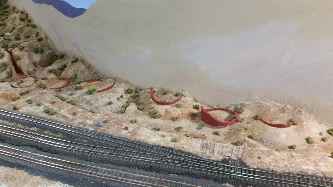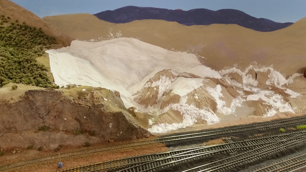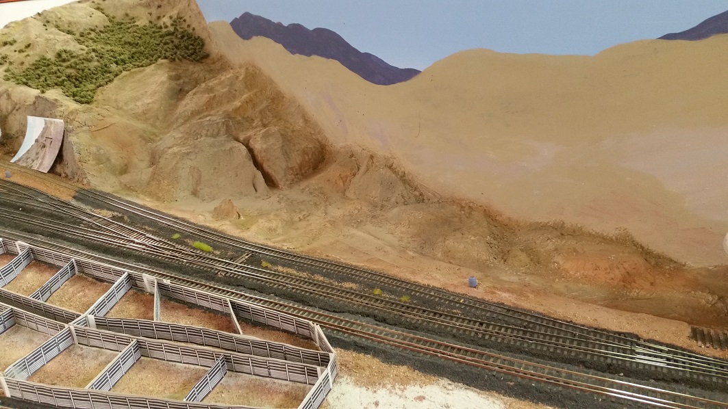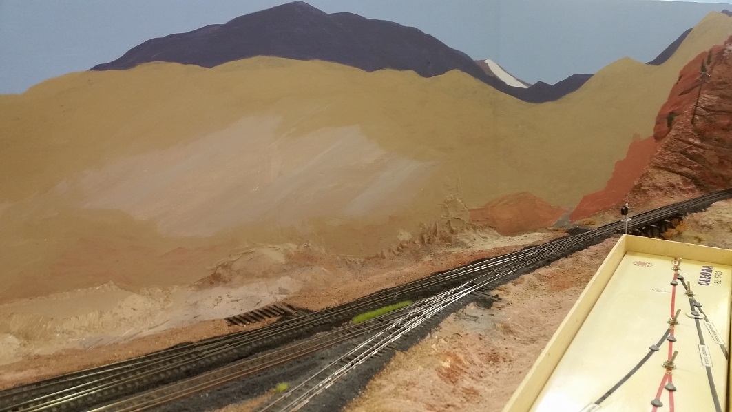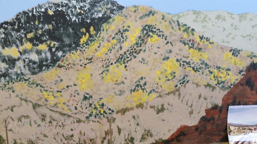 GaryM continued re-touching the backdrop along the front. The pinkish foreground hills were painted over in camel (tan), and