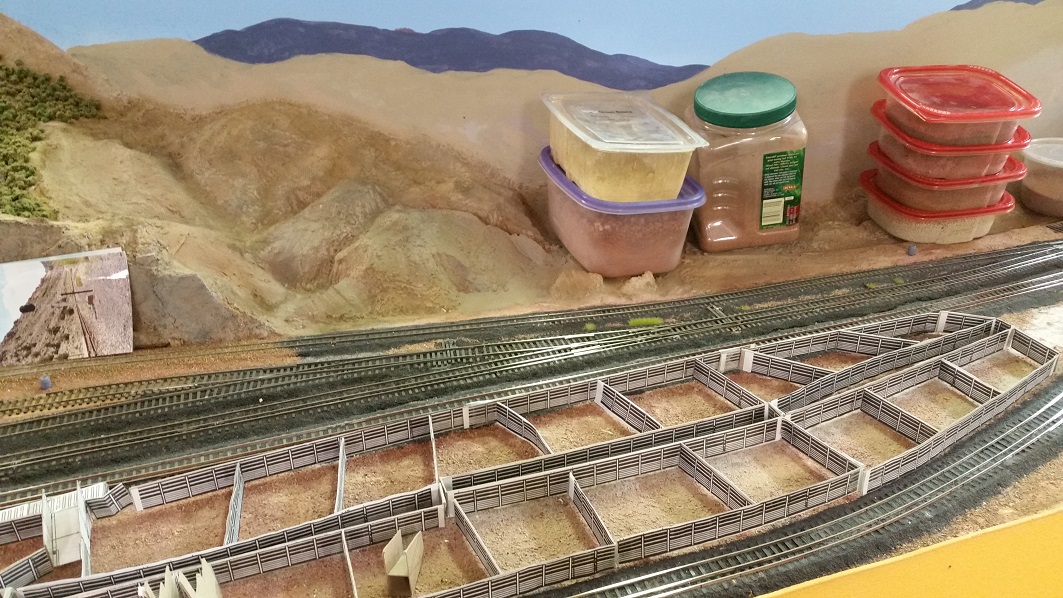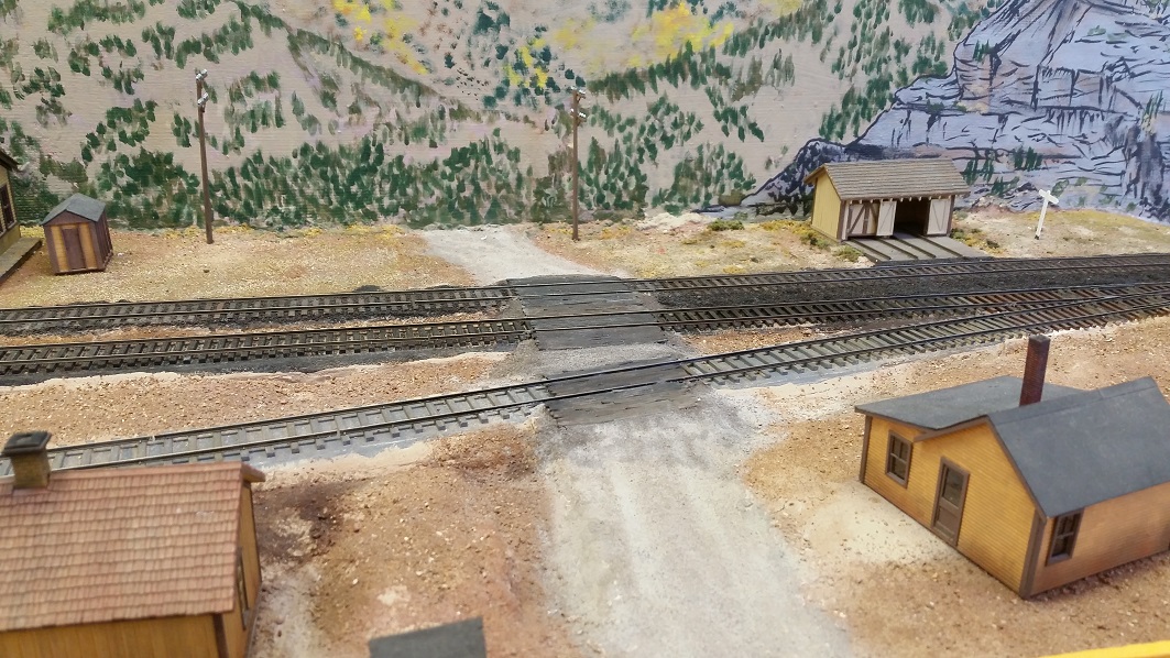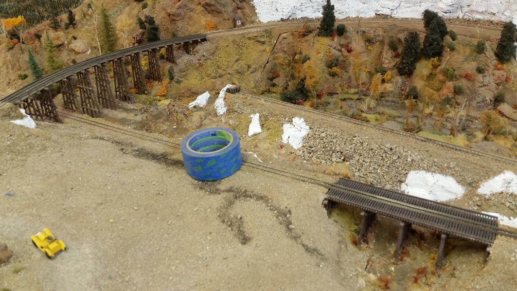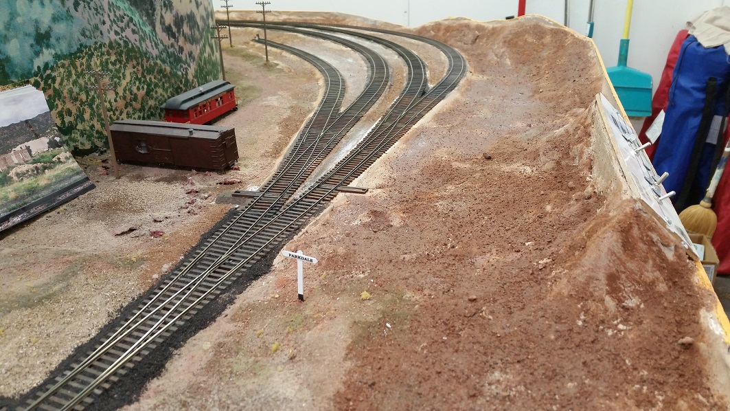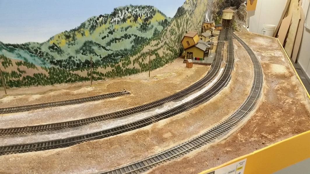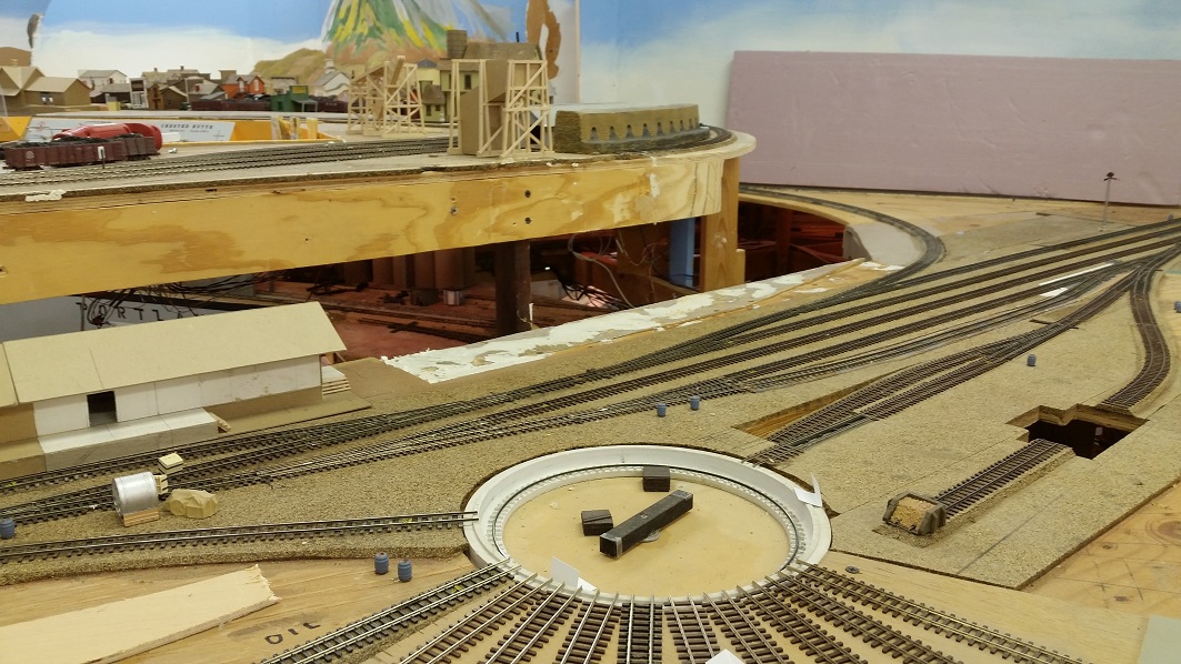 GaryM laid down the DG roundhouse foundations and started ballasting some tracks against the backdrops. The cardboard shims on the TT bridge were showing