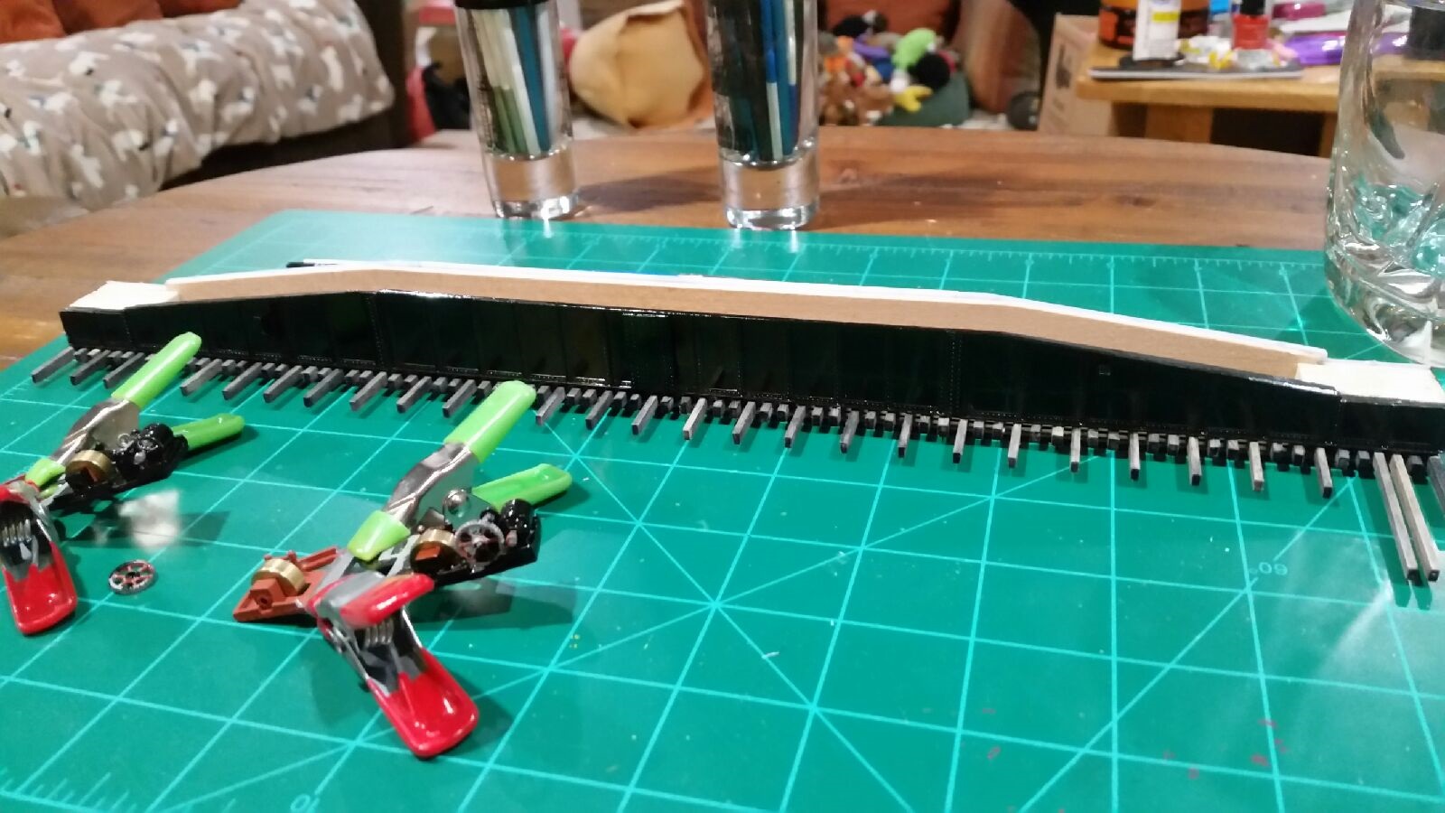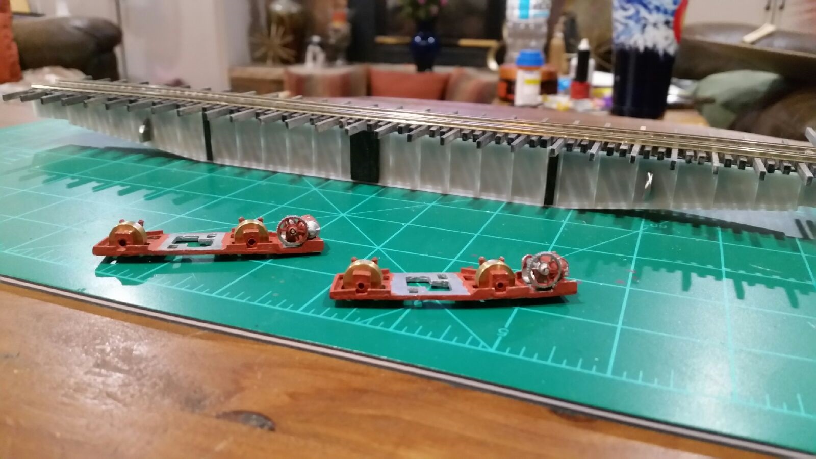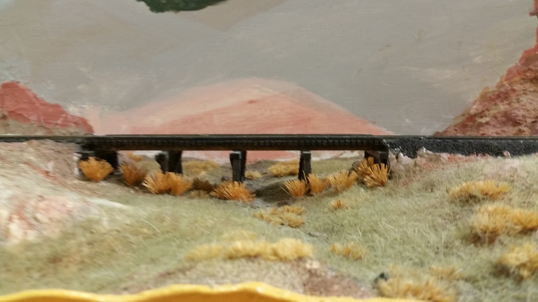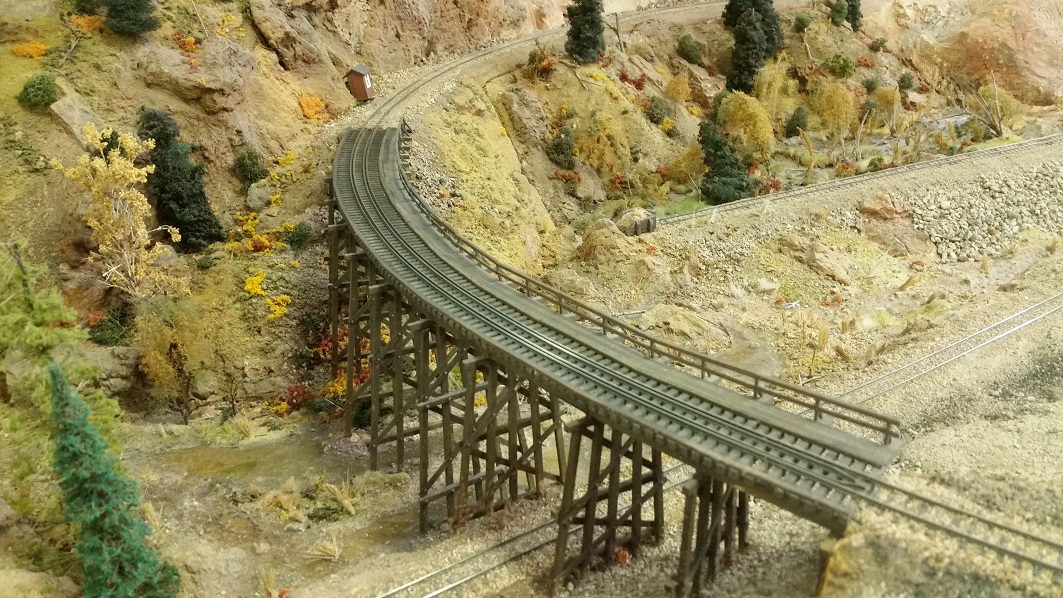 TomG stained the bridge guard rails on all the NG bridges to Gunnison, that DanielS had previously sanded down to NMRA gauge height. From the look of