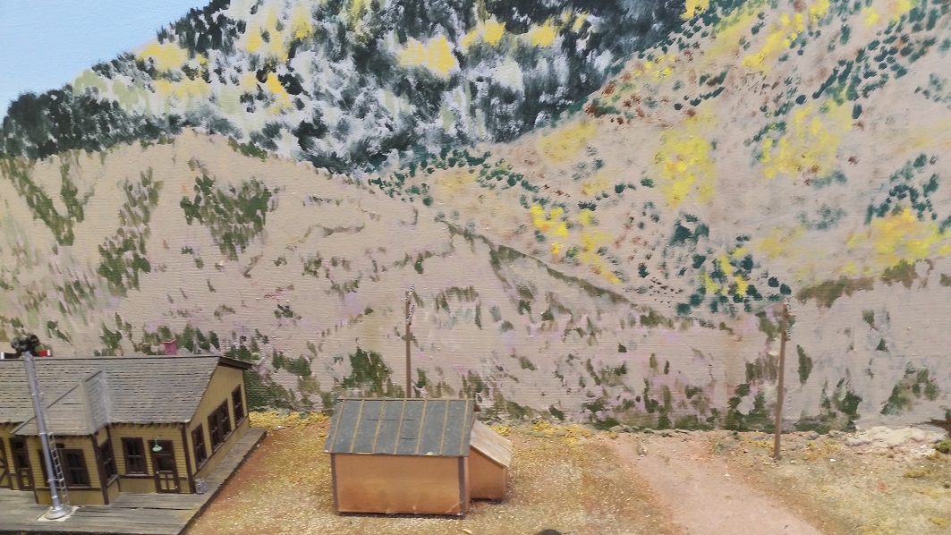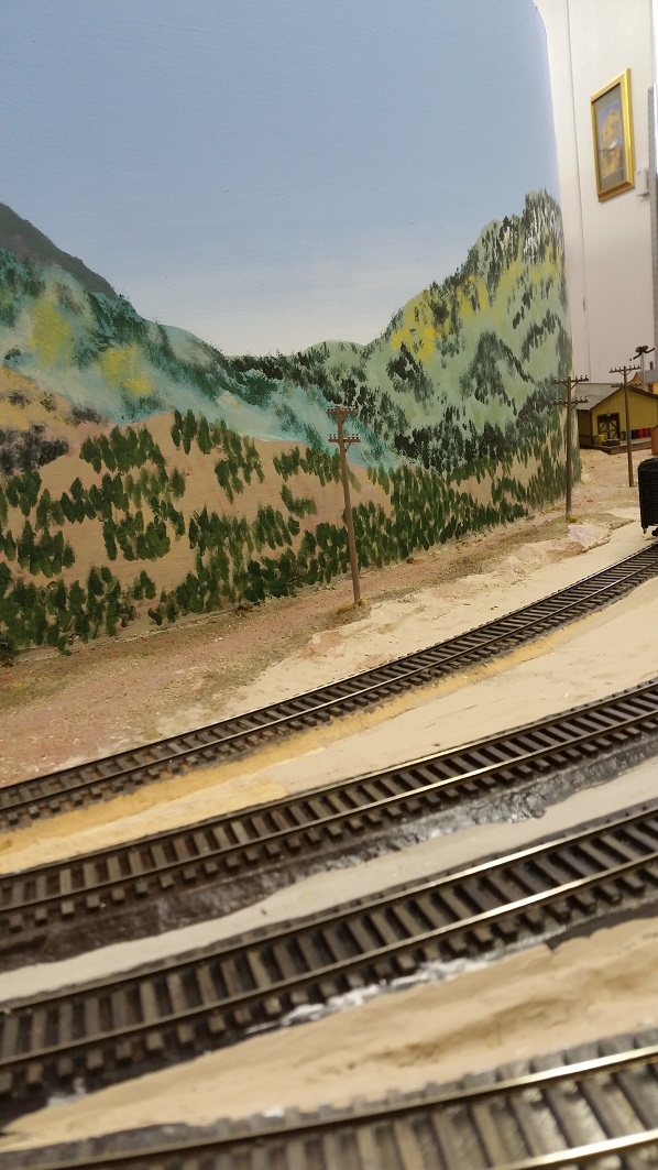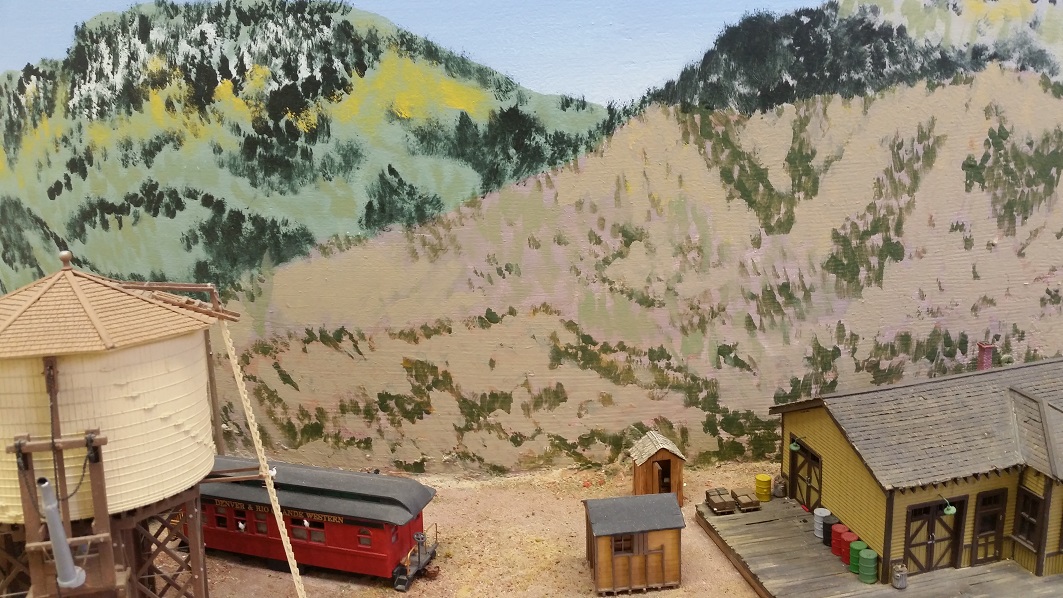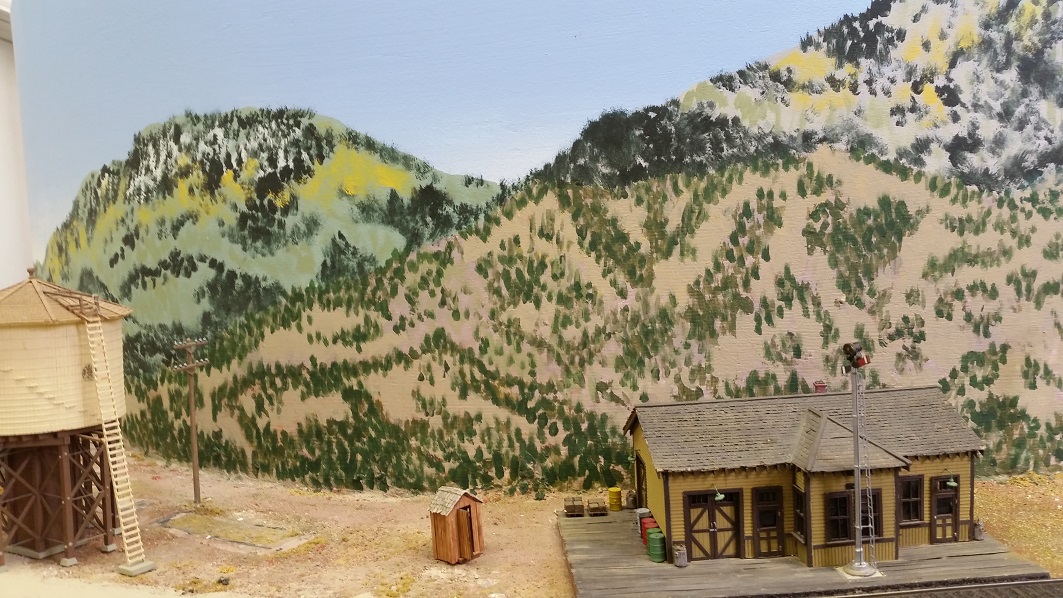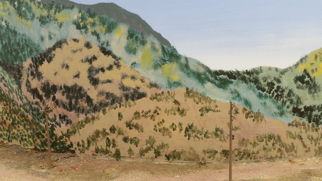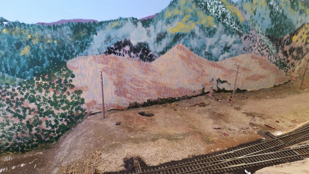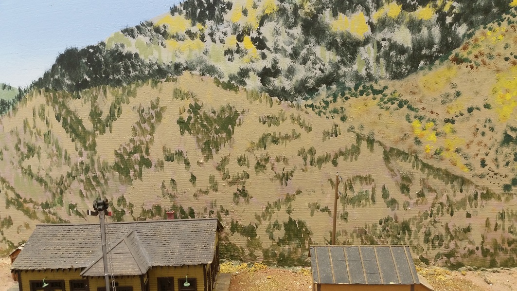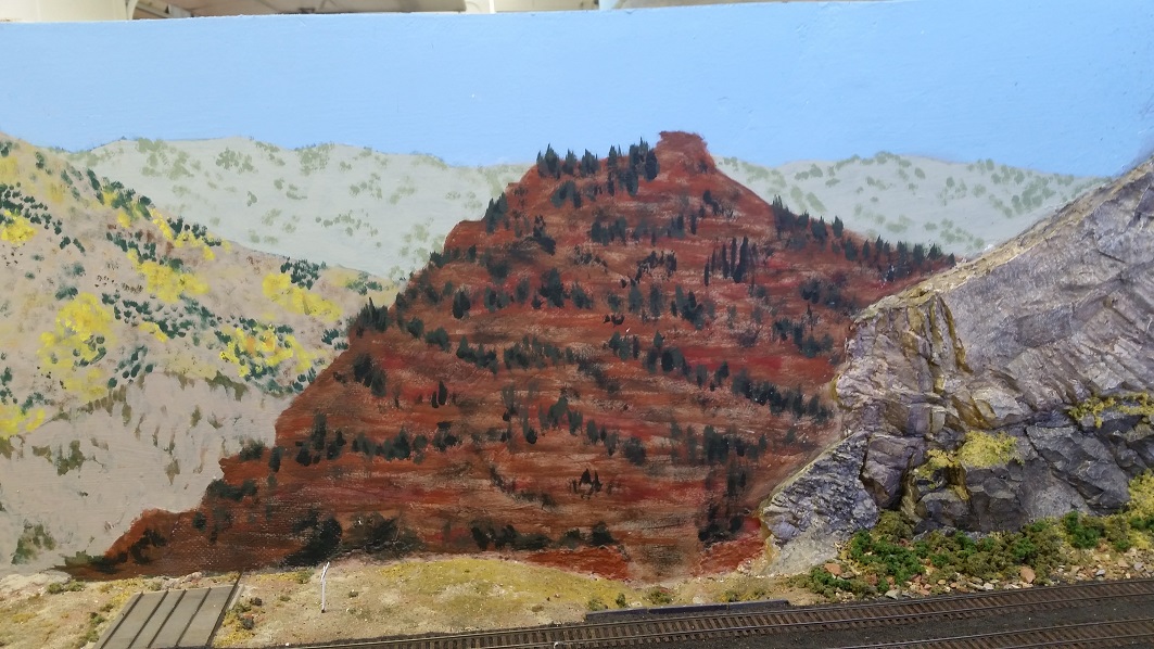 GaryM began repainting the backdrop to blend the Cleora hills. Even though there are no nearby ranges, a purple was used to paint a distant