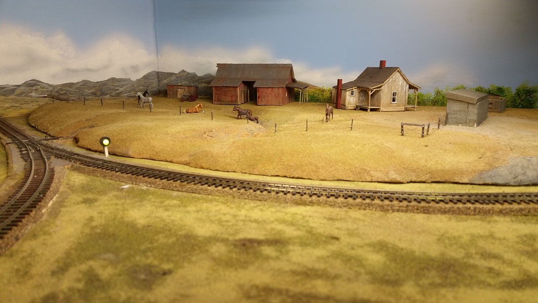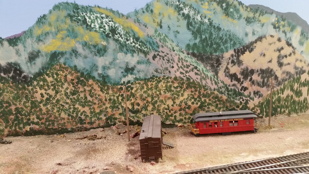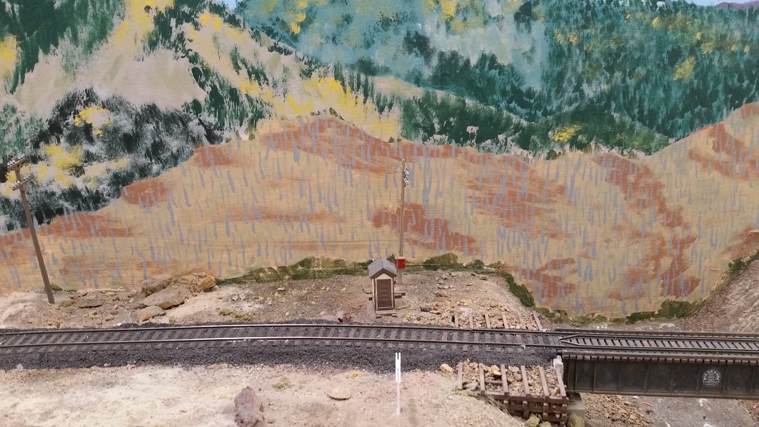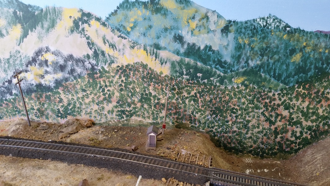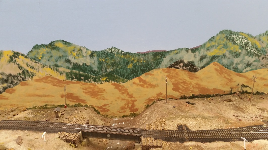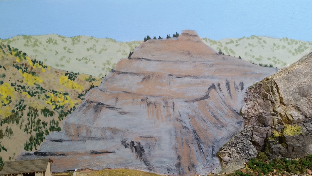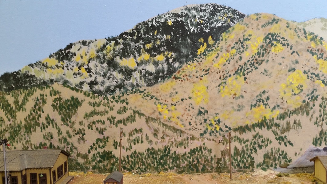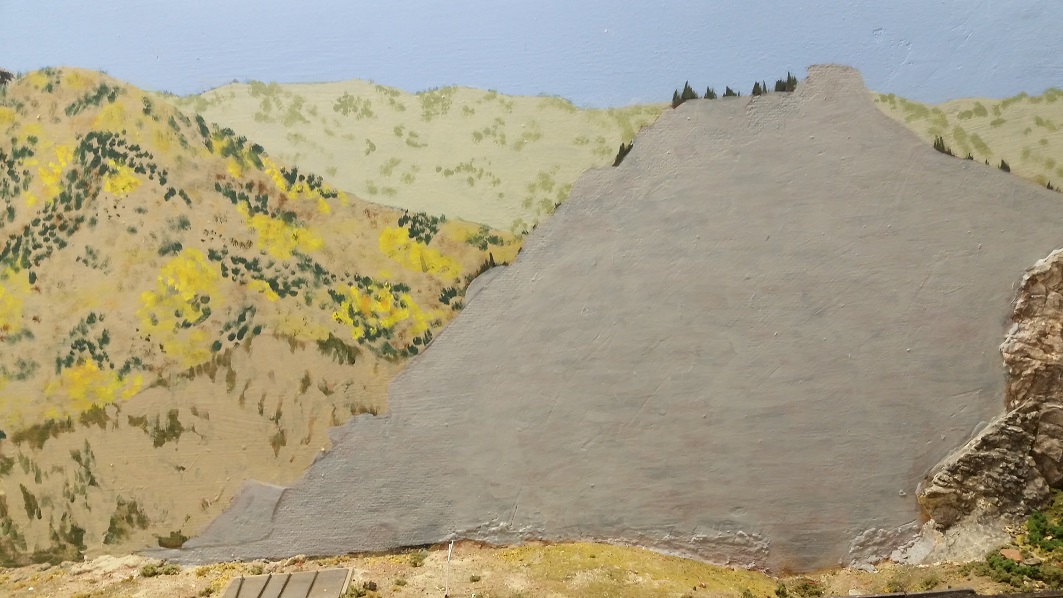 GaryM began repainting the backdrop to blend the Cleora hills. Even though there are no nearby ranges, a purple was used to paint a distant