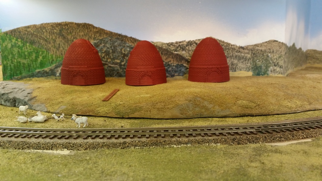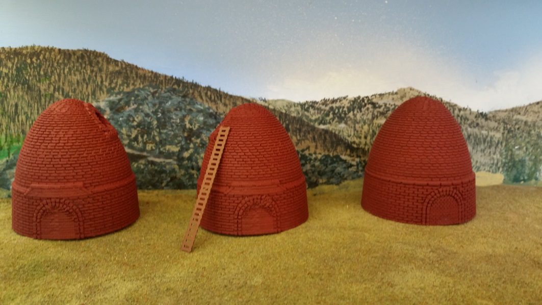 GrantC 3D printed and painted new charcoal kilns, 2 with facing open top portals for loading, and 1 closed operating kiln. The kilns were arranged in pairs.