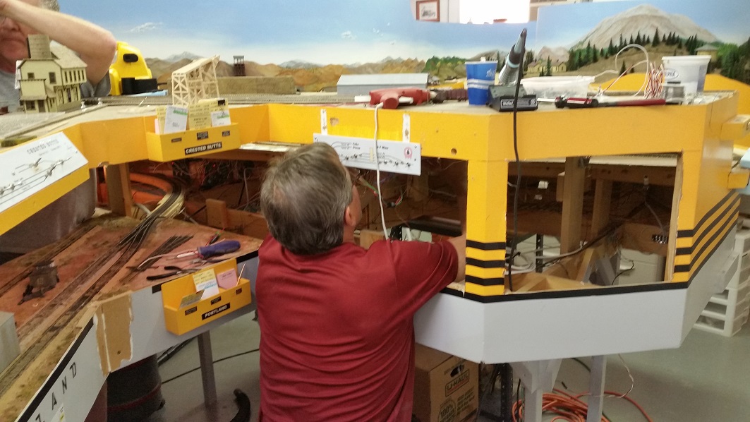 We encountered a major short which shutdown the Royal Gorge Route. TomG began checking track connections. GaryM began installing new switch