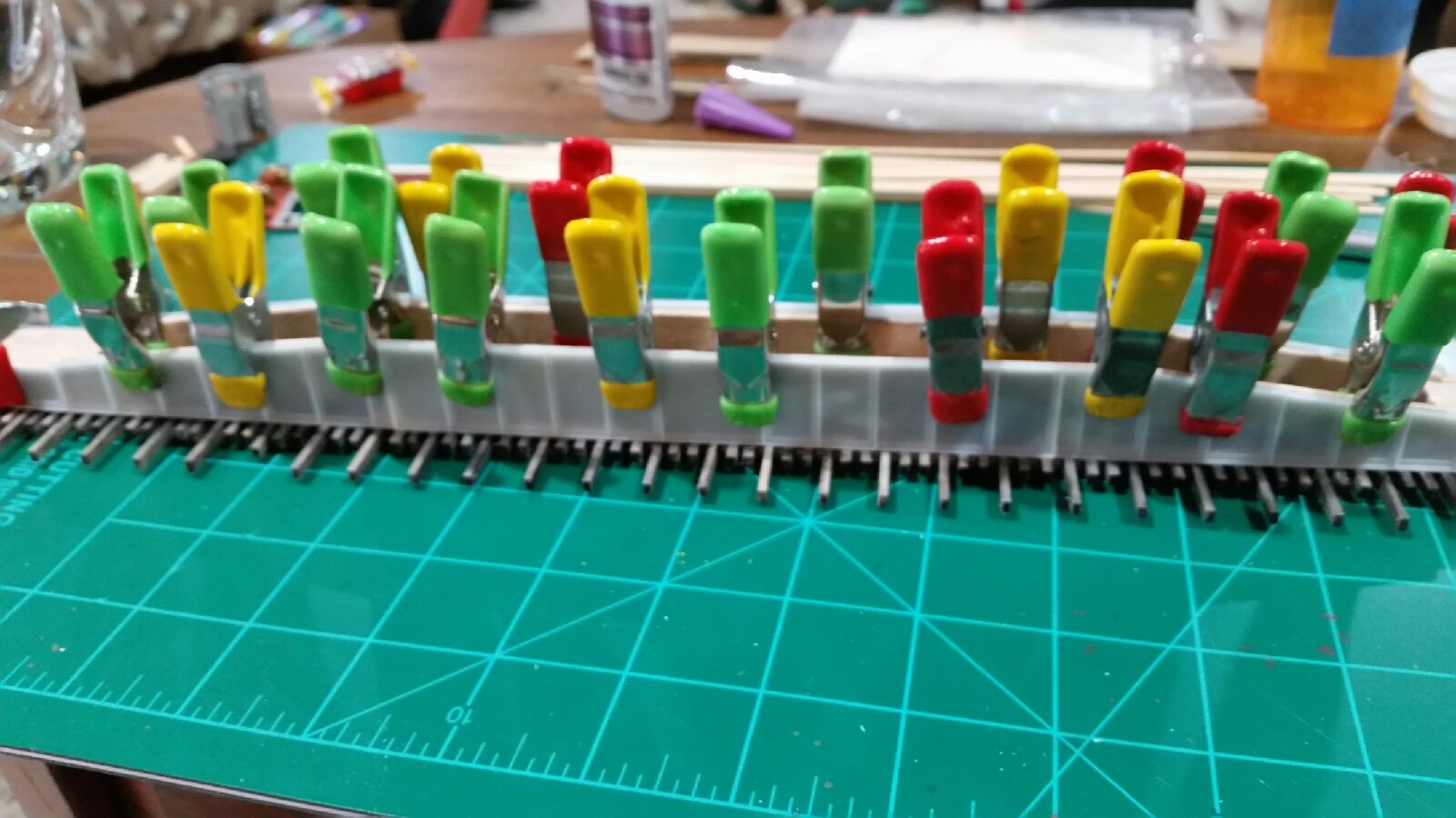 TomG & GaryM laid out where to put the buildings. TomG installed some platforms and GaryM started attaching a webbed paper base.