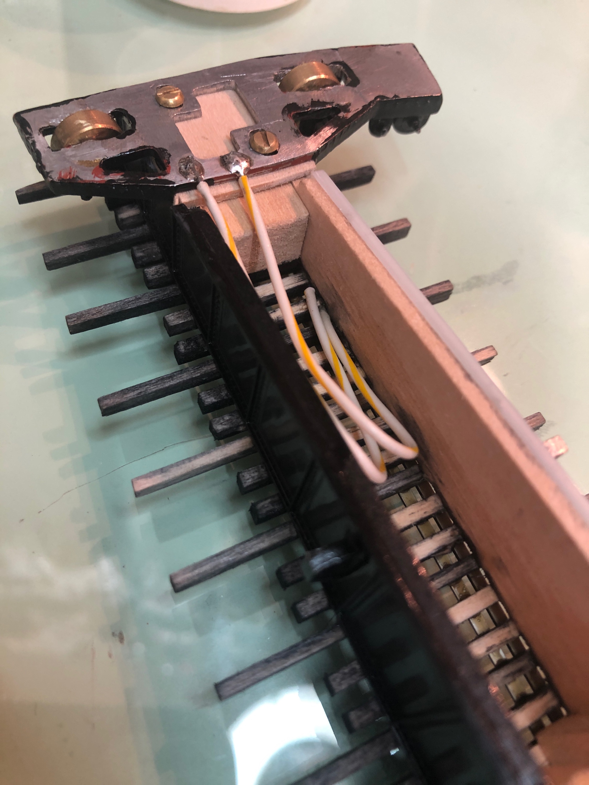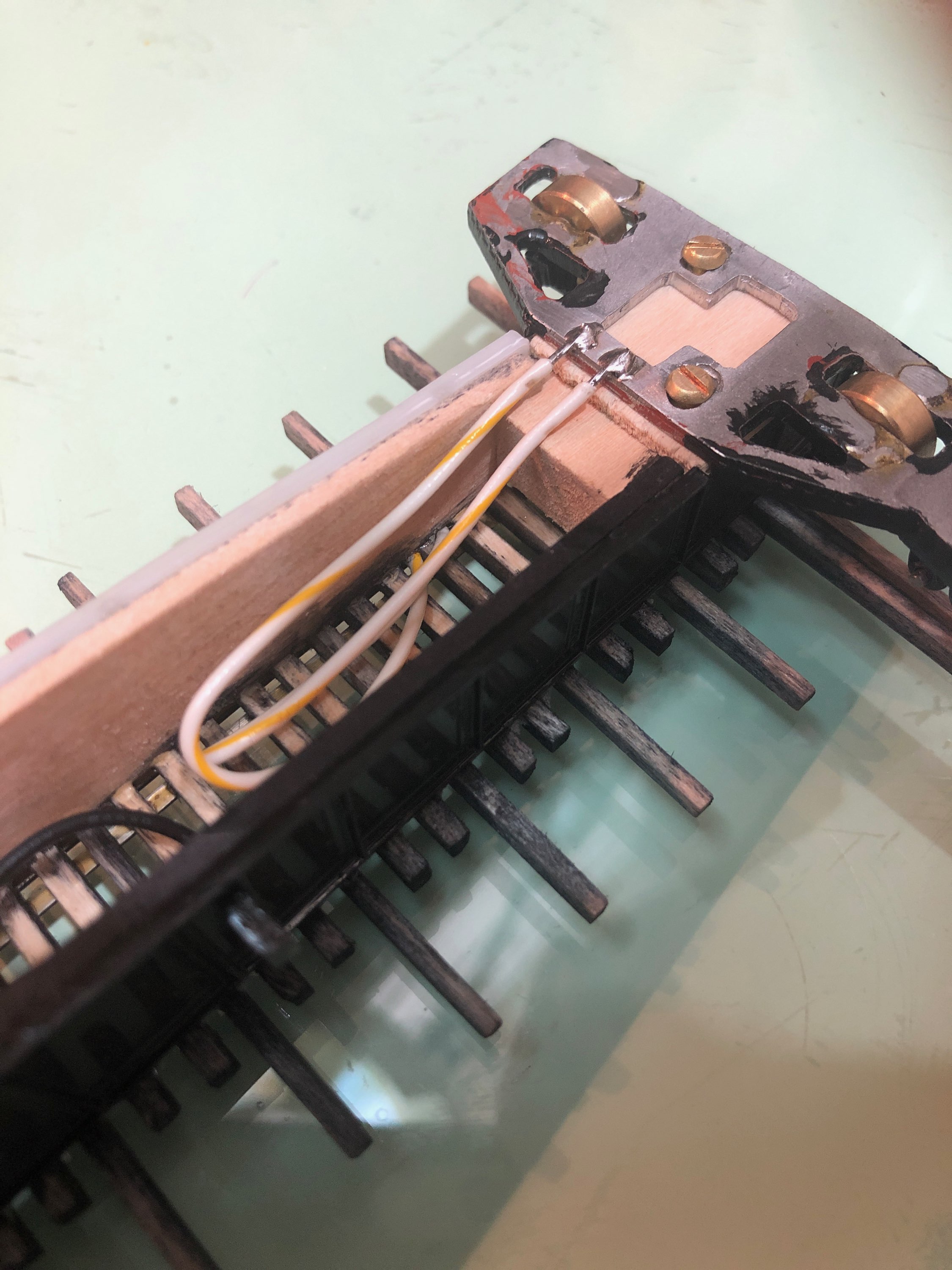 the rails. TomG soldered pickup wires from the dollies to one pair of rails, a pickup for the center post was soldered to the other pair