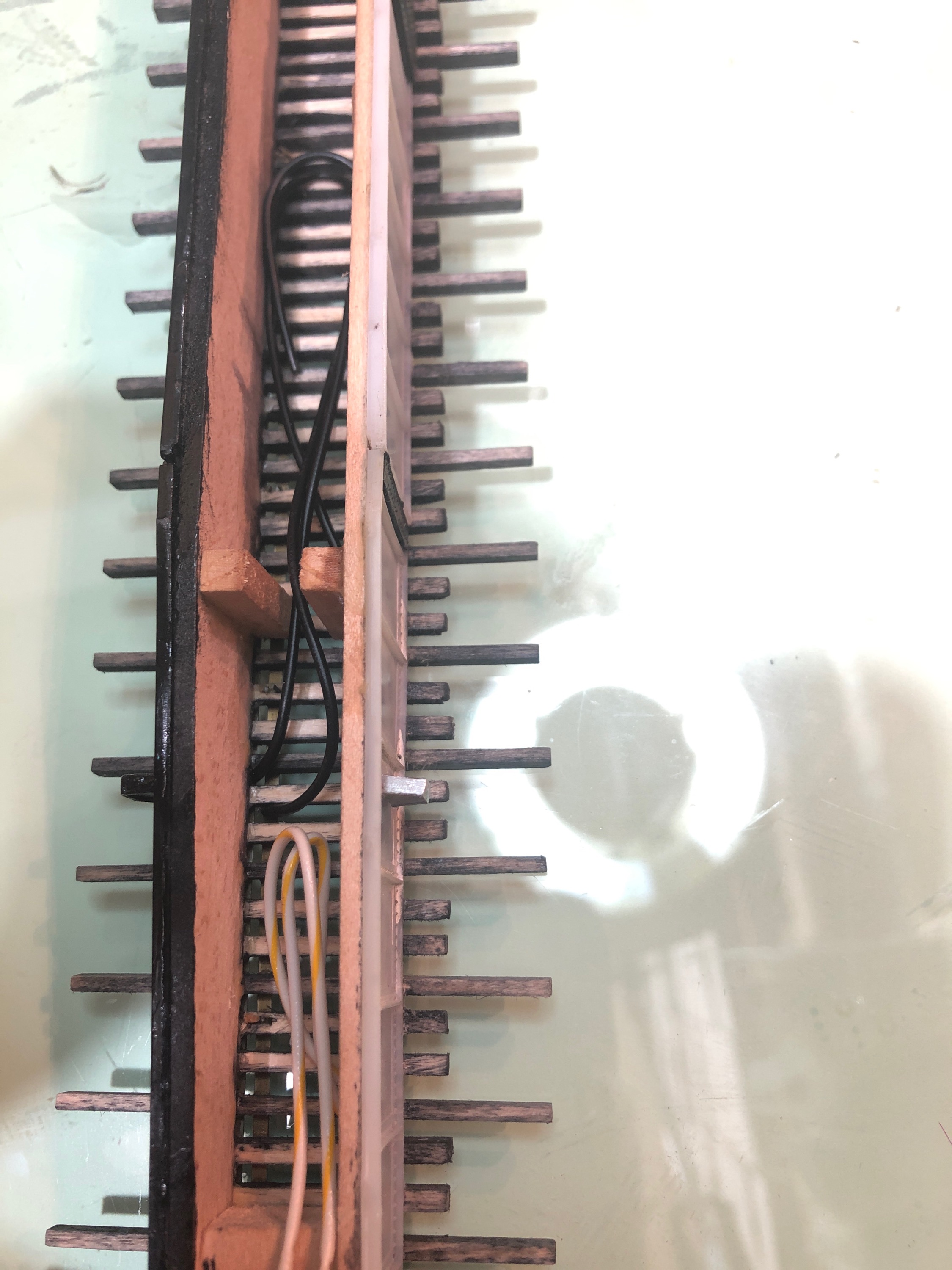GaryM completed hooking up the stall rail feeders and tested the TT. A shim was added to an end of the deck to prevent longitudinal shifts.