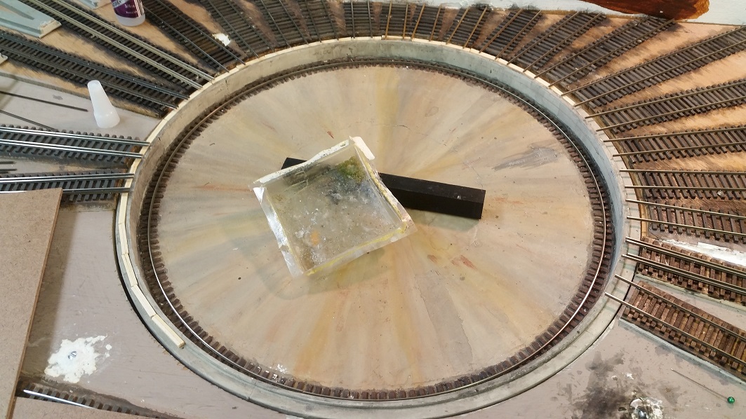The feeder connections were painted. Wood putty was inserted in the gap around the pit. After drying, excess putty was scraped from rails and