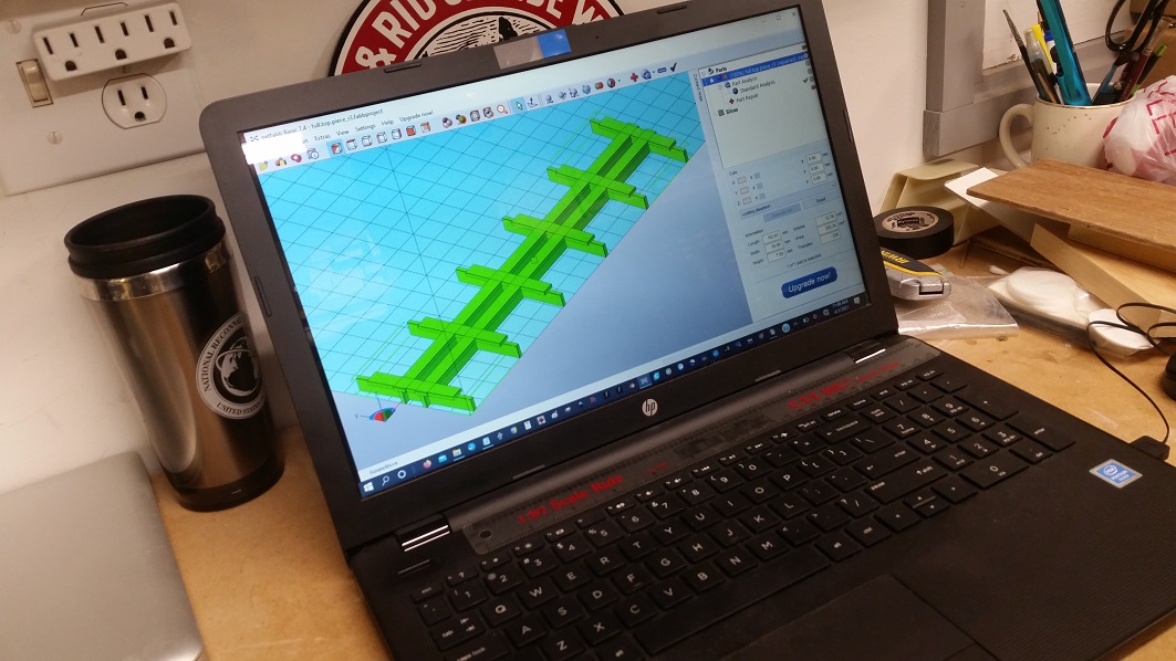 GrantC working on the Gunnison River bridge design. TomG and KentS building the drop shelf and track connections.