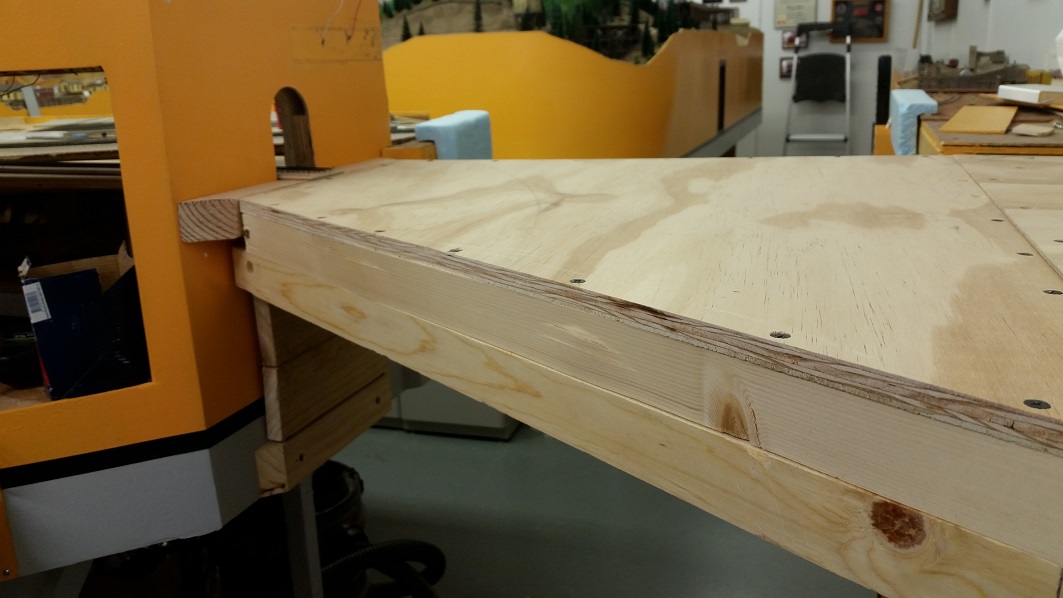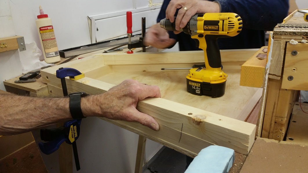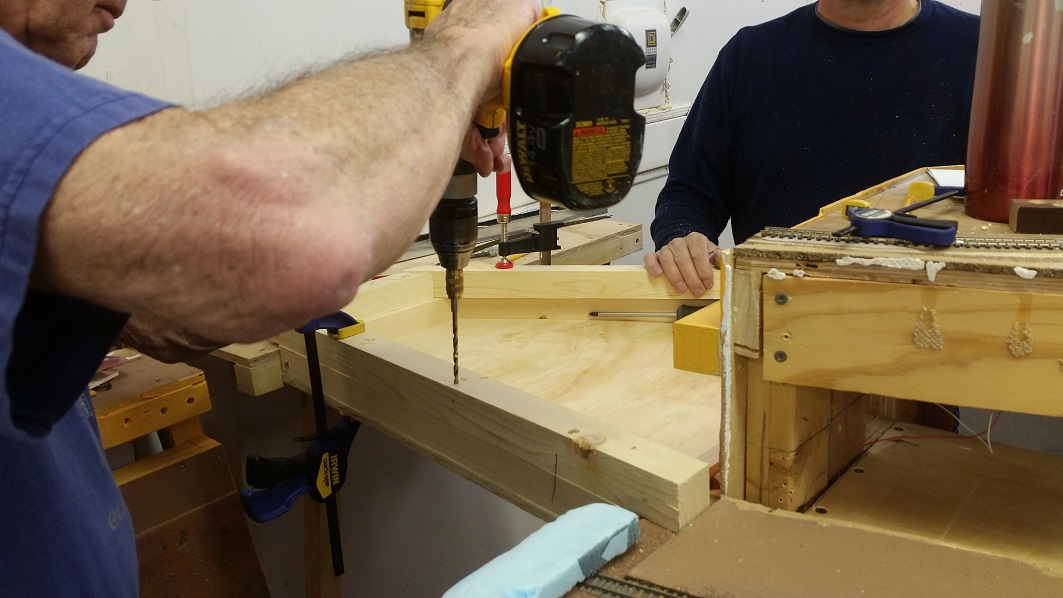 TomG and KentS continue building the drop shelf and track connections.