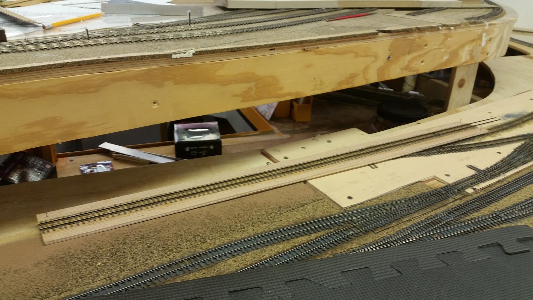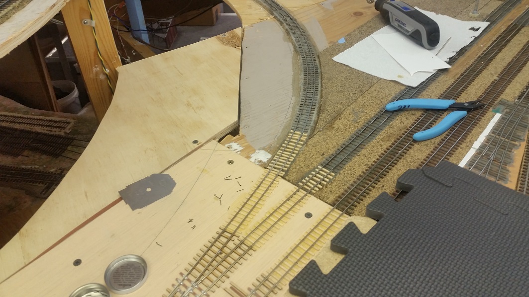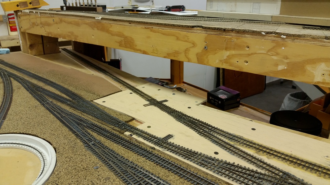 KentS enlarged the wye cutout, attached the dropshelf bumper. TomG worked on the subroadbed connection to the Baldwin line.