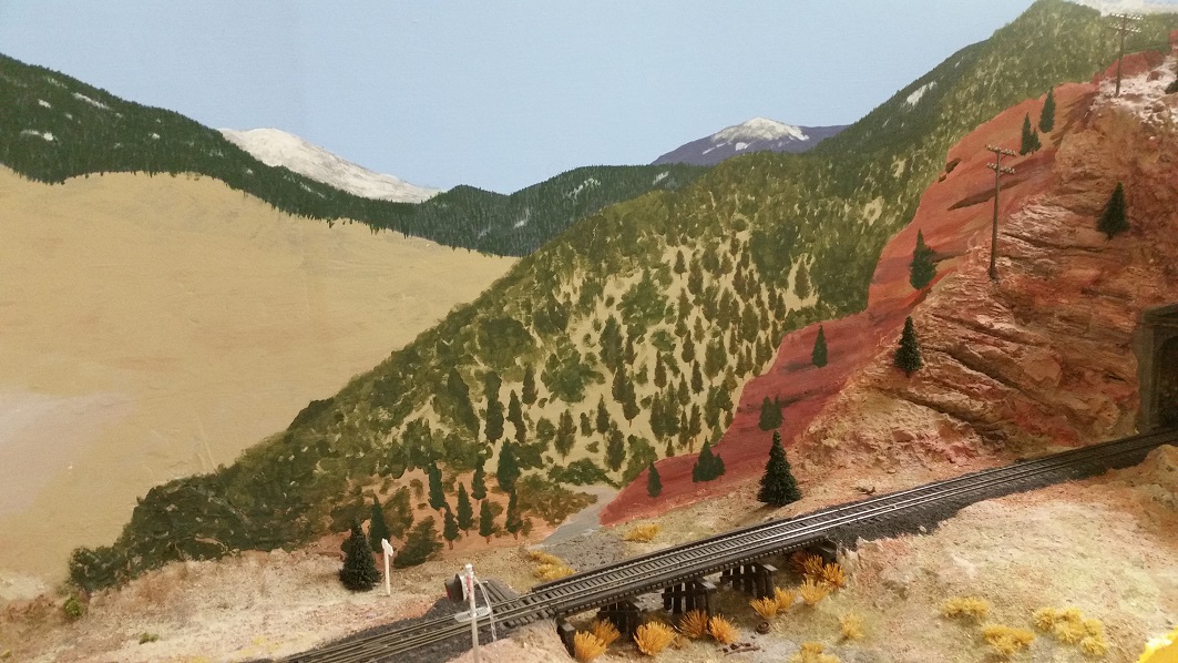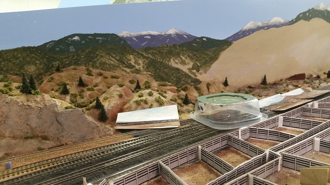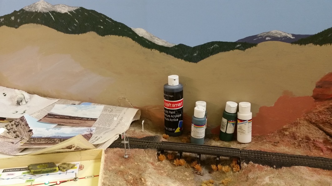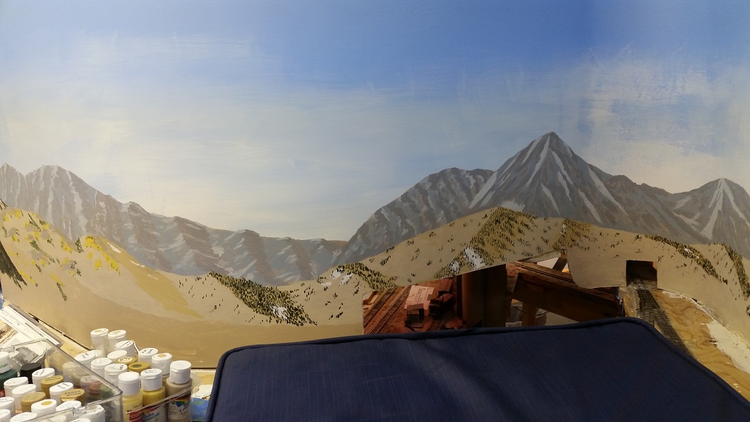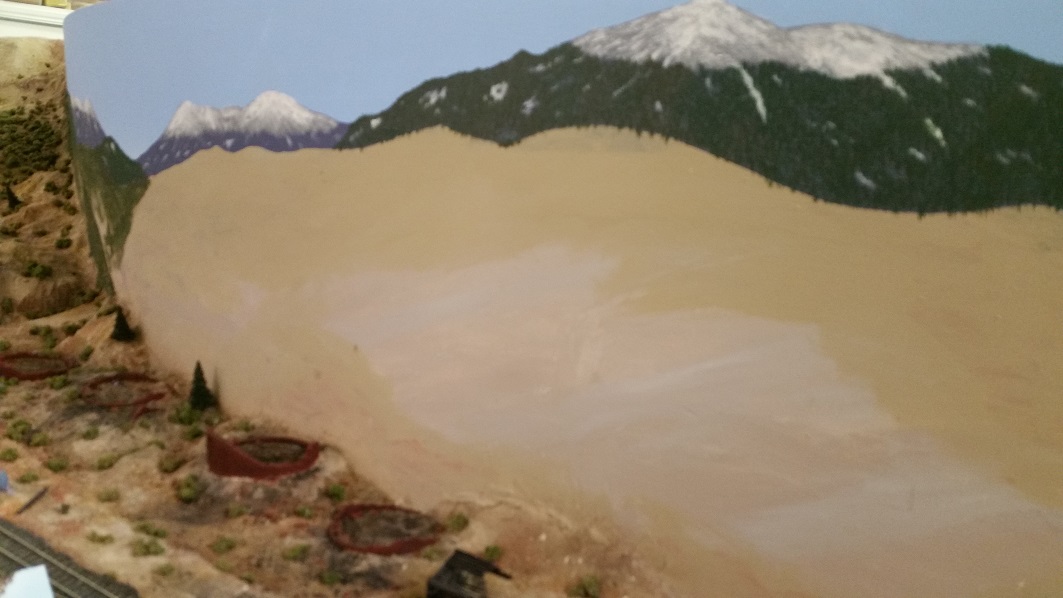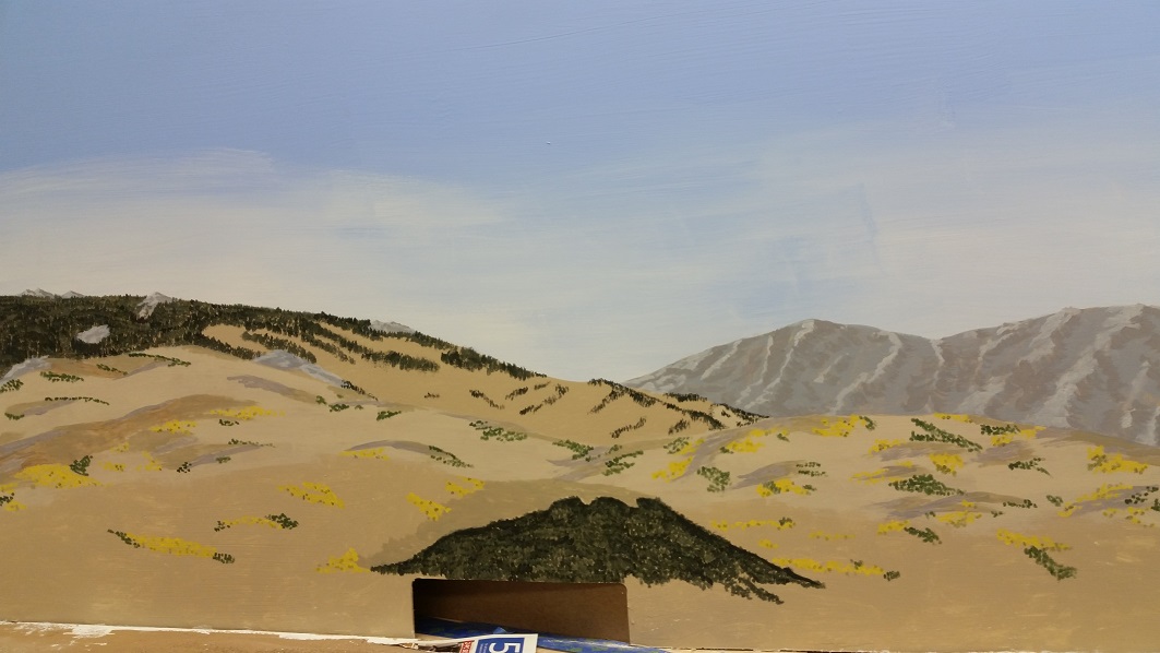 DanielS touched up the ancient roadbed spur and the charcoal kiln bricks, and began working on the backdrop.