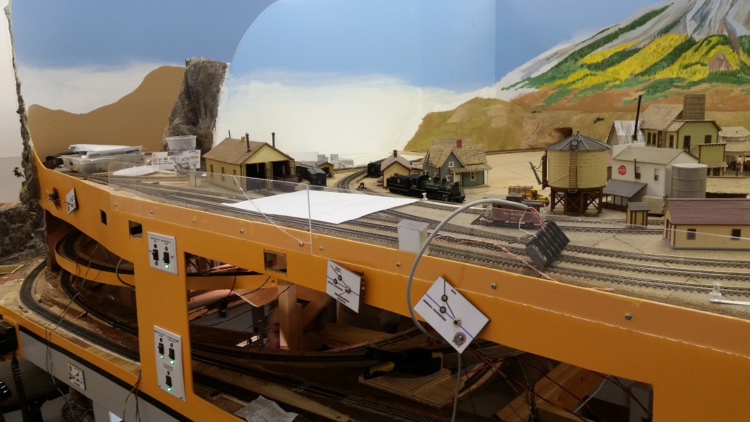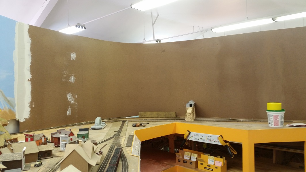 GaryM finished painting the backdrop. KentS connected switch machines to the switch panel.
