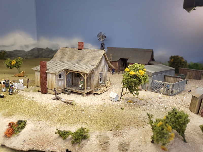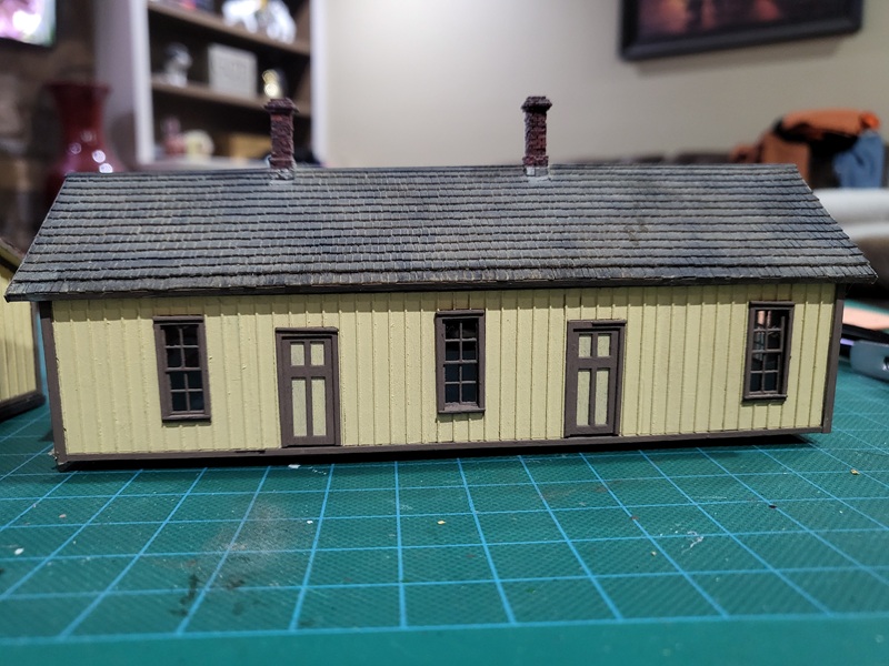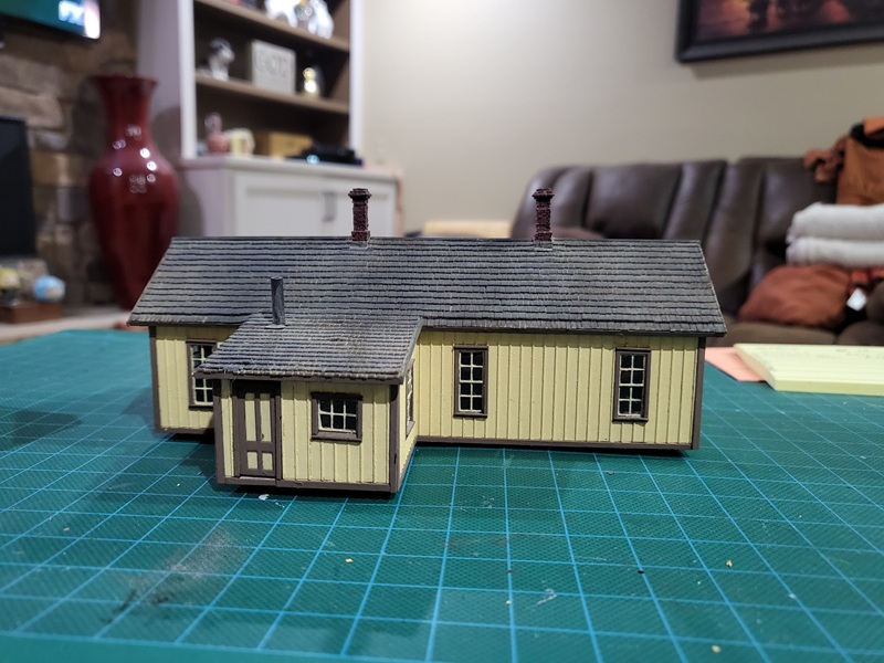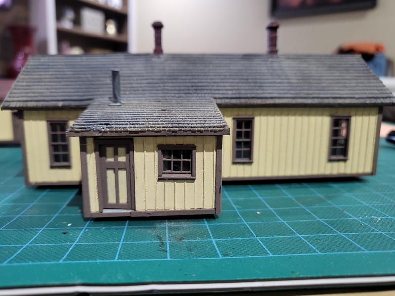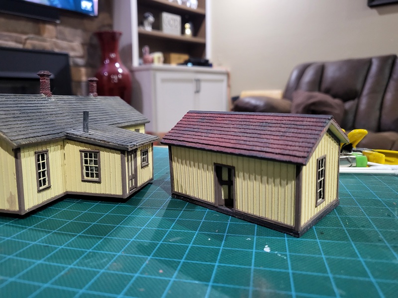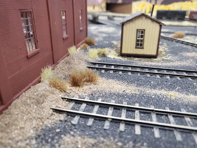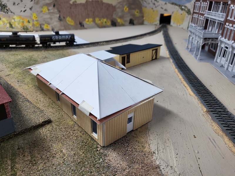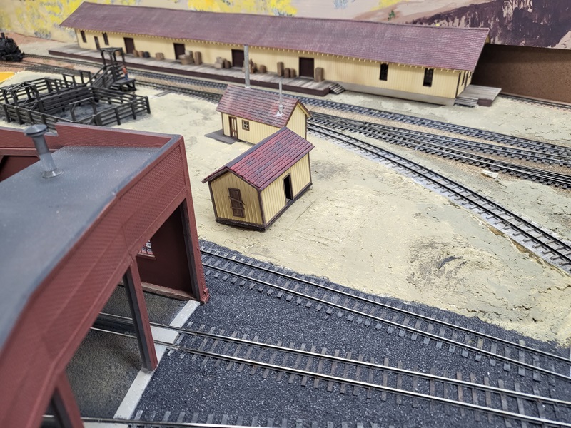 StuJ's Depot eating house and sheds complete. TomG's begun scenicking near the roundhouse and has the roundhouse tracks ballasted.