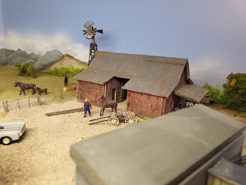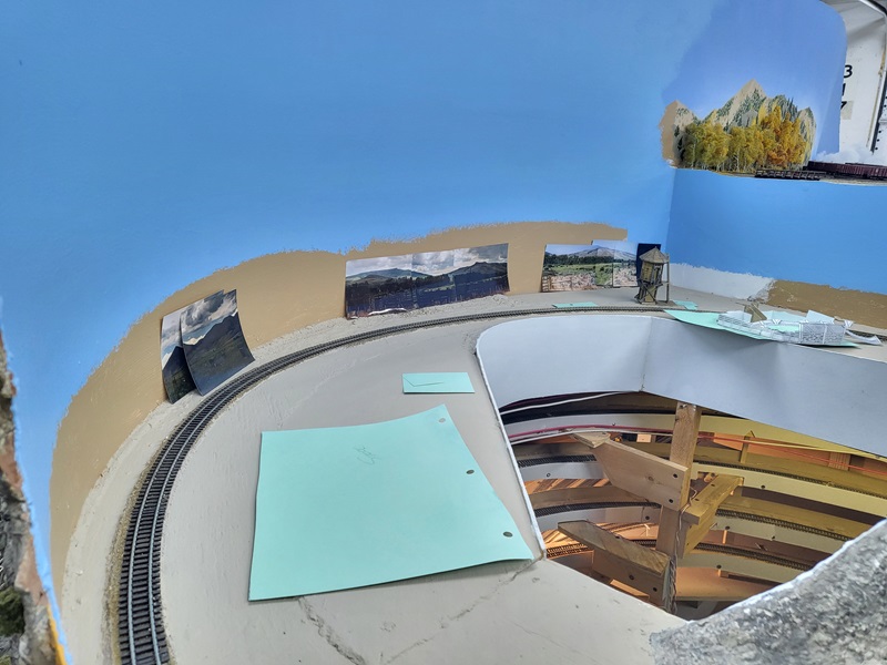 GaryMe repainted the backdrop blue in the helix, laid out templates for the stock pens, tank(s), pumphouse, and depot (car body).