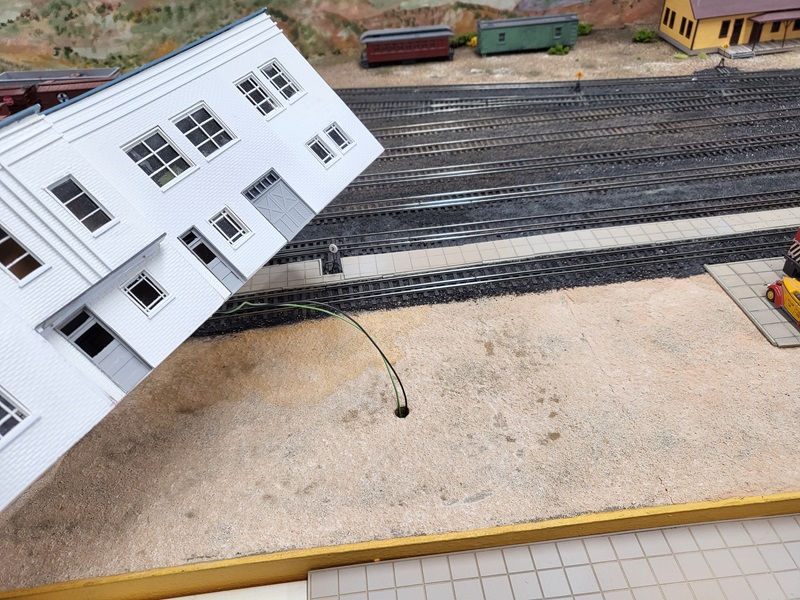Drilled a locating hole for the Art Deco Depot wiring. This hole was located at the west end of the removable "concrete platform" that is only used for the Monte Christo