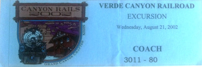 My ticket for today's excursion. The consist was FP7 1510, FP7 1512, generator car, first class coach "Scottsdale", first class coach "Santa Fe Bill", open car "Prescott", first class coach "Wickenburg", coach "Flagstaff", "open car "Camp Verde", coach "Sedona", open car "Miami", coach "Phoenix", open car "Jerome", coach "Cottonwood", open car "Clarkdale" and coach "Tucson". We left on time and I was off on my first NRHS excursion.