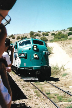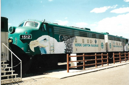 Verde Canyon Railroad FP7 1512 (ex. Wyoming Colorado 1512, exx. Mountain Diesel 1512, nee Alaska Railroad 1512. Built 1953 and painted for Alaska's bi-centennial in 1983. Mountain Diesel purchased and exhibited it at Portola Railroad Museum before leasing to WYCO in 1988. Until 1995, it pulled passenger cars from Laramie to Fox Park Moved to Clarkdale in November 1996.