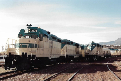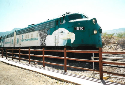 Verde Canyon Railroad FP7 1510 (ex. Wyoming Colorado 1510, exx. Mountain Diesel 1510, nee Alaska Railroad 1510. Built 1953 and painted for Alaska's bi-centennial in 1983. Mountain Diesel purchased and exhibited it at Portola Railroad Museum before leasing to WYCO in 1988. Until 1995, it pulled passenger cars from Laramie to Fox Park Moved to Clarkdale in November 1996.
