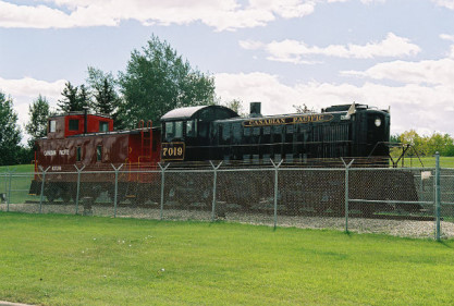 Canadian Pacific Railway S-2 7019 (nee CPR 7019 1985) and Canadian Pacific caboose 4347358 (nee CP 437358 1987) on display together at the 14th Street entrance to Heritage Park.