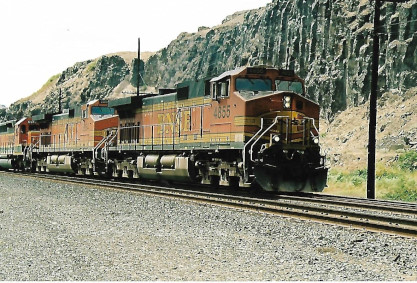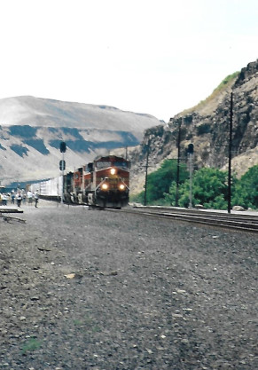 We take a siding at Bingen, Washington to let a BNSF freight train through.