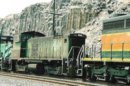 BNSF GP39E 2907 (ex. BN 2907, exx. BN 2531 nee CB&Q 985) leads an eastbound freight through Wishram before the steam train can depart.
