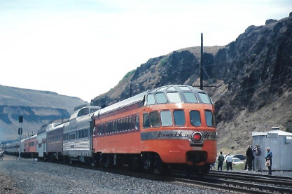 Milwaukee Road 53 "Super Dome" (ex. NCDOT 400301 "Mount Mitchell" '96, exx. UPRR for OLS and excursion use 1995, exxx. C&NW 421 "Powder River" 1985, exxxx. Rail Travel Assoc. 53 1983 (rebuilt), retired 1982 to Great Western Tours, exxxxx. VIA 2701 1978, exxxxxx. CN 2701 1974, exxxxxxx. CN 2401 "Athabasca", nee MILW 53. PPCX 800862.