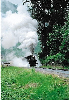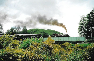 Mount Rainier Scenic Heisler 91 leading a runby across the Nisqually River bidge with Scotch Broom in full bloom. Our next stop was at Elbe to take on water.