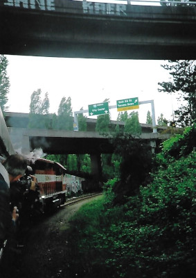 Approaching the concrete bridge at MP 36 which had low clearances, hence the Tacoma Rail officials on the other end.