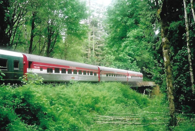 Tacoma Municipal Belt Line coach 40010 (ex. TMBL 4001, exx. AMTK 7003, exxx. AMTK 7411, exxxx. PC 1580, nee PRR 1580), coach 40020 (ex. TMBL 4002, exx. AMTK 7004, exxx. AMTK 7404, exxxx. PC 1573, nee PRR 1573) and coach 40030 (ex. TMBL 4003, exx. AMTK 7000, exxxx. PC 1569, nee PRR 1569) at the Tilton River trestle.