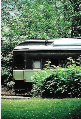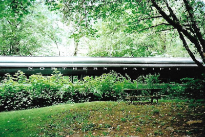 Northern Pacific coach 1681 partially hidden by the bushes at the picnic area.