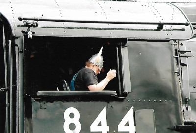 Steve Lee, the then-head of the Union Pacific steam program, in a Viking helmet. History does not relate the reason for this.
