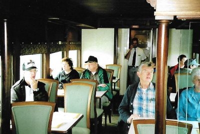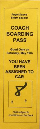 My ticket which was the lower level of Union Pacific dome car "Missouri River Eagle". The Puget Sound Steam Special was being operated by the Union Pacific Railroad, Burlington Northern Santa Fe on behalf of the Barriger Library of the University of Missouri at St. Louis, and the Oregon Rail Heritage Foundation.