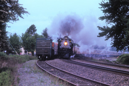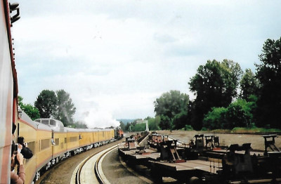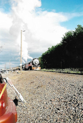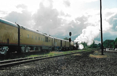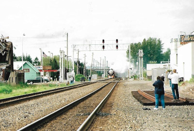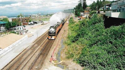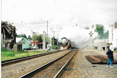 Union Pacific 4-8-4 844 at Tacoma. The day was not quite over yet, however. The two steam engines had been on public display in Fife for five days prior to these trips. My friend David Cantlin was working for the City of Fife Parks Department at the time and he relayed the following to me: "I am not boasting but the "public" event would not have happened without me. The UP was sponsoring two excursions with the steamers but besides that, nothing. I found out about the engines coming to Fife to lay over between runs. Our City was celebrating it's 50th anniversary that year so the City was trying to have a special event for each month of the year to reflect Fife's 50th. I went to the City Manager and proposed we make an event of the Steamers. I was given the go-ahead so I contacted UP and they liked the idea of opening up the trains as a static display for the public. I was given contact info to the Yard Manager in Fife. I arranged for Public Works to build a temporary parking lot by the yard office. I also made up signs and put them all over including hobby shops. I was put in touch with the Excursion Conductor as he was kind of the on-site supervisor for the event. I arranged for Fife Schools to bring students also. Our support/event ran through before the excursions and ended the Monday following when the train packed up and headed South. One real regret I had was not taking a ride on the train to East Lacey that they offered me when leaving.....I couldn't find somebody to take me home from East Olympia. Looking back I would have walked today. I also had Tacoma Rail attend. I was very busy as I was the City Contact, there was Public Works support and we also had some traffic control for cars to get on and off the site."