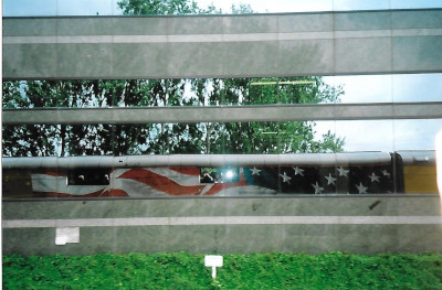 I spent some of the time in the "Council Bluffs" baggage car and photographed the car in one of the reflective glass office buildings of Seattle.