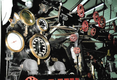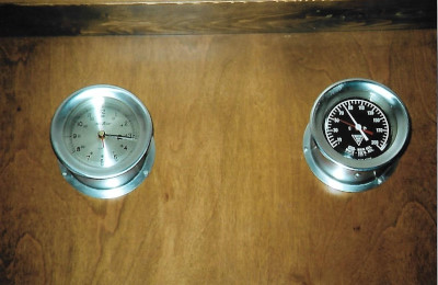 Clock and gauge on the wall of Union Pacific "Idaho". I returned to the baggage car as the train travelled along Puget Sound.