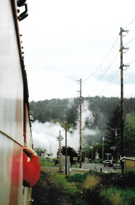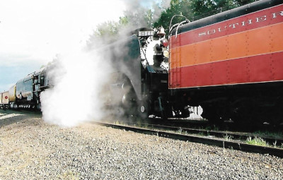 On the southbound trip, a vestibule view of the steam from Southern Pacific 4449 and Union Pacific 844.