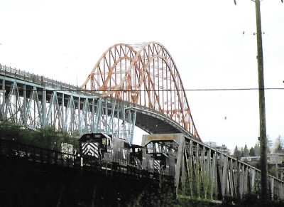 A light engine move of Southern Railway of B.C. SD38 382, MP15DC 153 and SD38 381 coming off the Fraser River bridge.