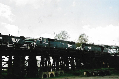 WCXX FP7A 4069 (ex. VIA 6569 1995, exx. VIA 1425 1980, exxx. VIA 4069 1979, exxxx. CP 4069 1978, exxxxx. CP 1425 1965, nee CP 4069 1954) crossing the trestle bridge.
