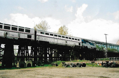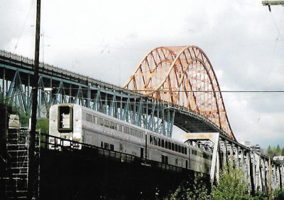 Amtrak Cascades 510 crossing the Fraser River bridge en route to Pacific Central station. Superliners were substituting for the normal Talgo consist at this time.
