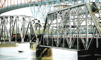 The rear of Amtrak Cascades crossing the Fraser River with the Pattullo Bridge behind.