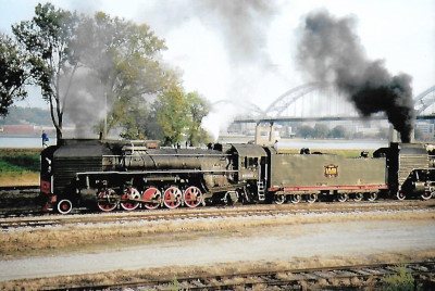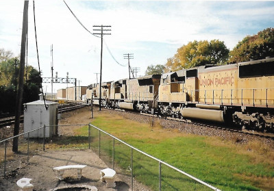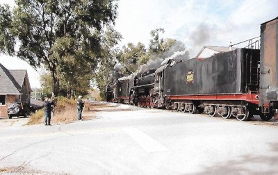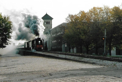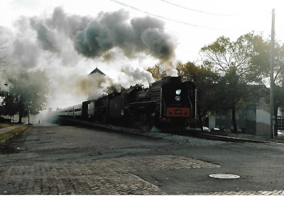 Double-headed steam on a cool autumn morning as the train enters street running on Fifth Street in Davenport, as taken by Bob who was chasing.