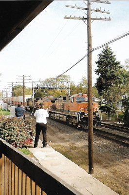 A westbound BNSF double stack freight rolls past Rochelle as Chris takes a picture of it.