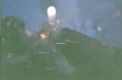 The headlight of Nickel Plate Road 2-8-4 765 shining through the steam on a very early morning.