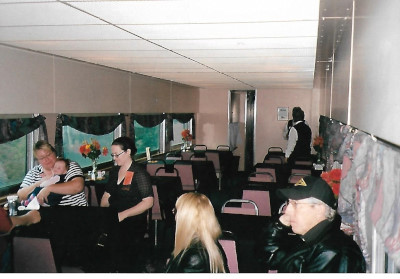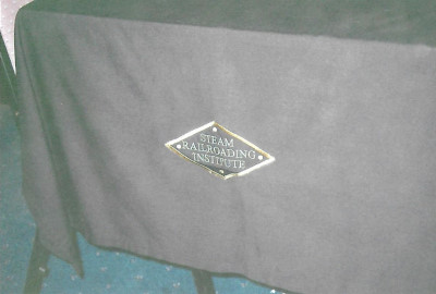 The Steam Railroading Institute emblem on the tablecloths in the dining car.