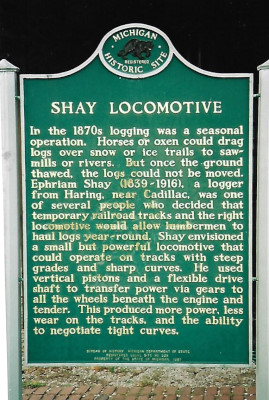 Cadillac-Soo Lumber Company Shay 1 (ex. Cadillac Lumber and Chemical Company 3, nee Boyne City and Southeastern 3). It was built in 1898 and upon Cadillac-Soo Lumber ceasing operations in 1956, was donated to the City of Cadillac. It is on display in City Park near the corner of South Lake Street and West Cass Street.