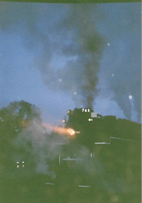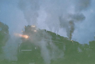 Nickel Plate 2-8-4 765 in the pre-sunrise gloom with smoke and a rain shower.