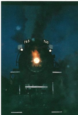 Head-on view of Nickel Plate 765 at Alma on the point of our train.