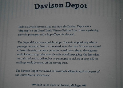 After a good breakfast and checking out of the hotel in Owosso, Bob and I drove to Flint but were greeted by a sign that said the museum was closed on Mondays and Tuesdays. As the sign gave a number to call, we called the Gennessee County Parks Department, which operates Crossroads Village, and they arranged for one of their people to come out and give us a tour. It turned out it was the archivist and she was full of interesting information; unfortunately I did not make note of her name. We started the tour at the station.