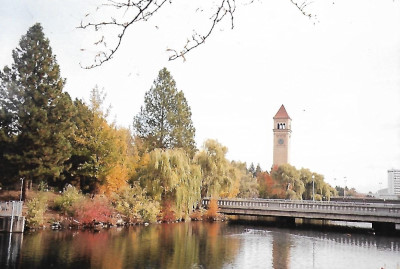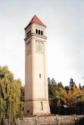 Riverfront Park with the Spokane River and the Great Northern Railway station clock tower. Riverfront Park was created for Expo '74, which was built on the grounds of the former Great Northern Railway yards.